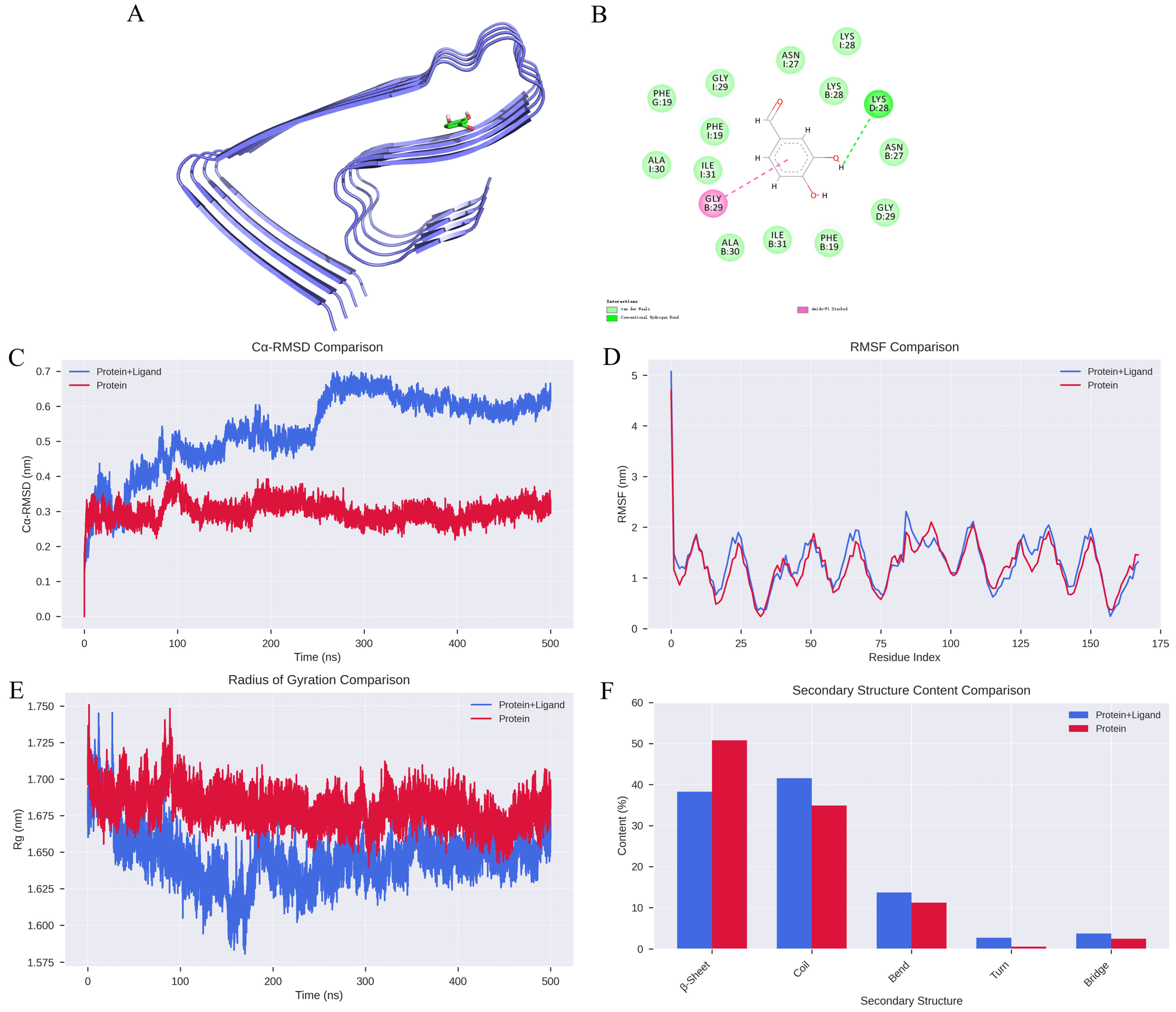 15]. The presence of two phenolic hydroxyl groups and an aldehyde group in its structure endows the molecule with the capacity to act as both a hydrogen bond donor and acceptor, coupled with moderate hydrophobicity (LogP~1.3). This unique combination of properties enables DBD to flexibly engage with biological macromolecules through multifaceted non-covalent interactions, including hydrogen bonding, hydrophobic effects, and π-π stacking. These interactions are likely provide the chemical basis for its ability to disrupt the structural stability of Aβ fibrils, thereby contributing to the inhibition of amyloid fibril formation. Resveratrol interacts with Aβ-42 dimers via π-π stacking interactions, inducing conformational changes in Aβ oligomers and attenuating their cytotoxicity [