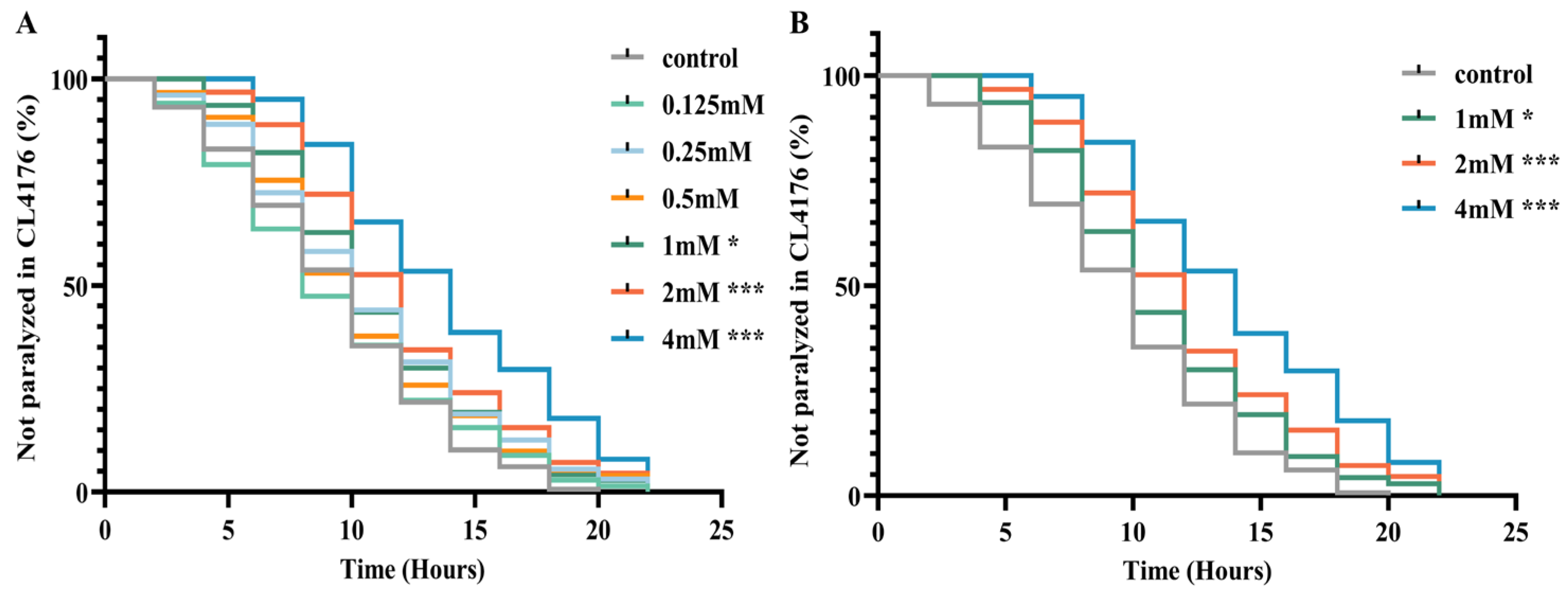 48]. To induce Aβ1–42 expression, CL4176 worms were shifted from 15 °C to 25 °C starting at the L3 stage. This timing ensured developmental synchrony while providing a sufficient induction window for the paralytic phenotype to become fully penetrant during adulthood. Synchronized L1-stage CL4176 worms were placed on NGM plates, with or without pharmacological agents, at a density of approximately 30–50 worms per plate, using three parallel plates for each group. The temperature was maintained at 16 °C for 36 h, and then raised to 25 °C for the next 24 h. Worm paralysis was monitored and recorded every 2 h until complete paralysis was observed.