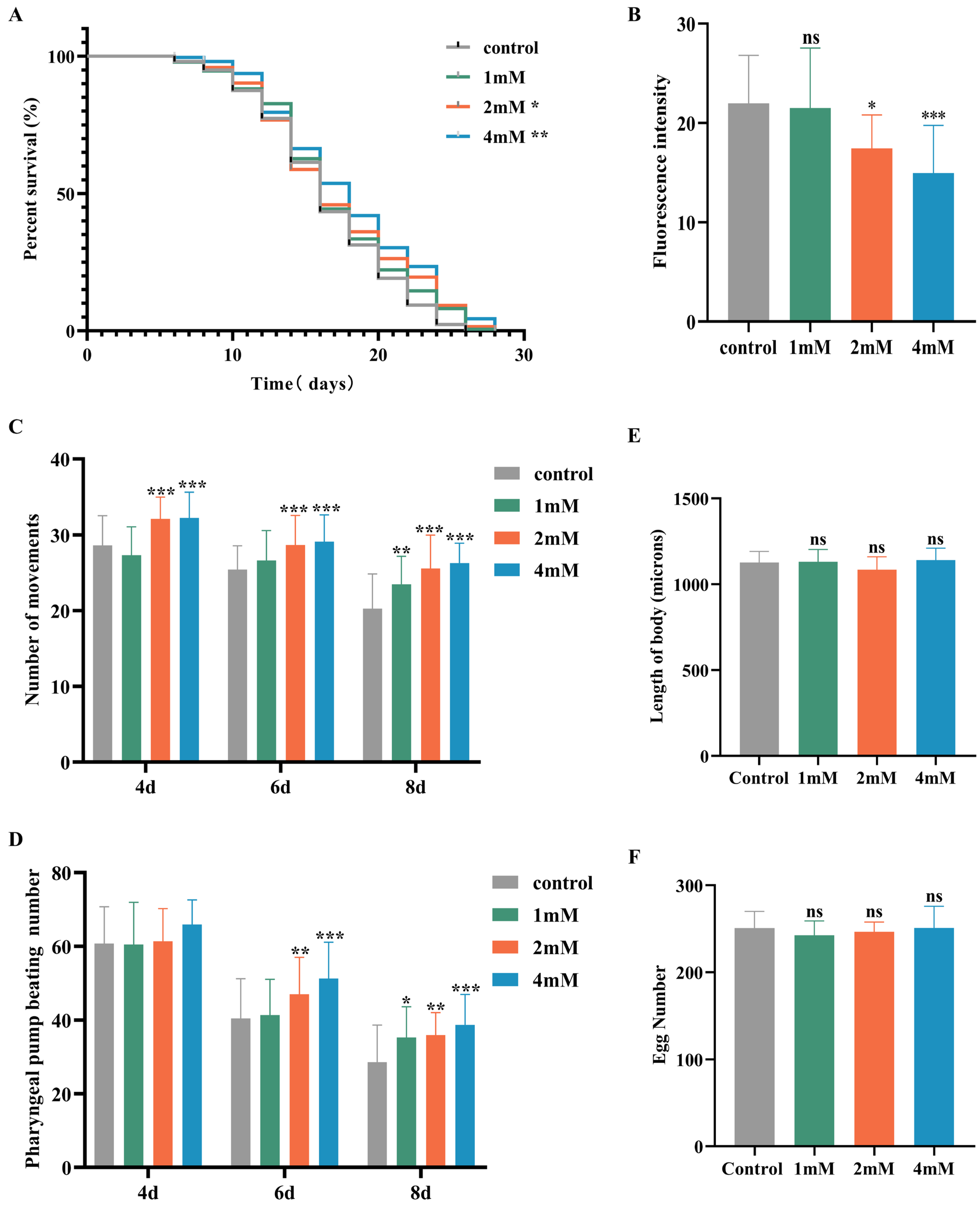 Following synchronization at the L3 stage, worms were maintained at 20 °C on plates containing varying drug concentrations or no drug. Pharyngeal pumping was documented under a dissecting microscope at specified time points (days 4, 6, and 8). The pumping frequency was determined by counting the pharyngeal contractions within 30 s for each of the 20 worms per group.