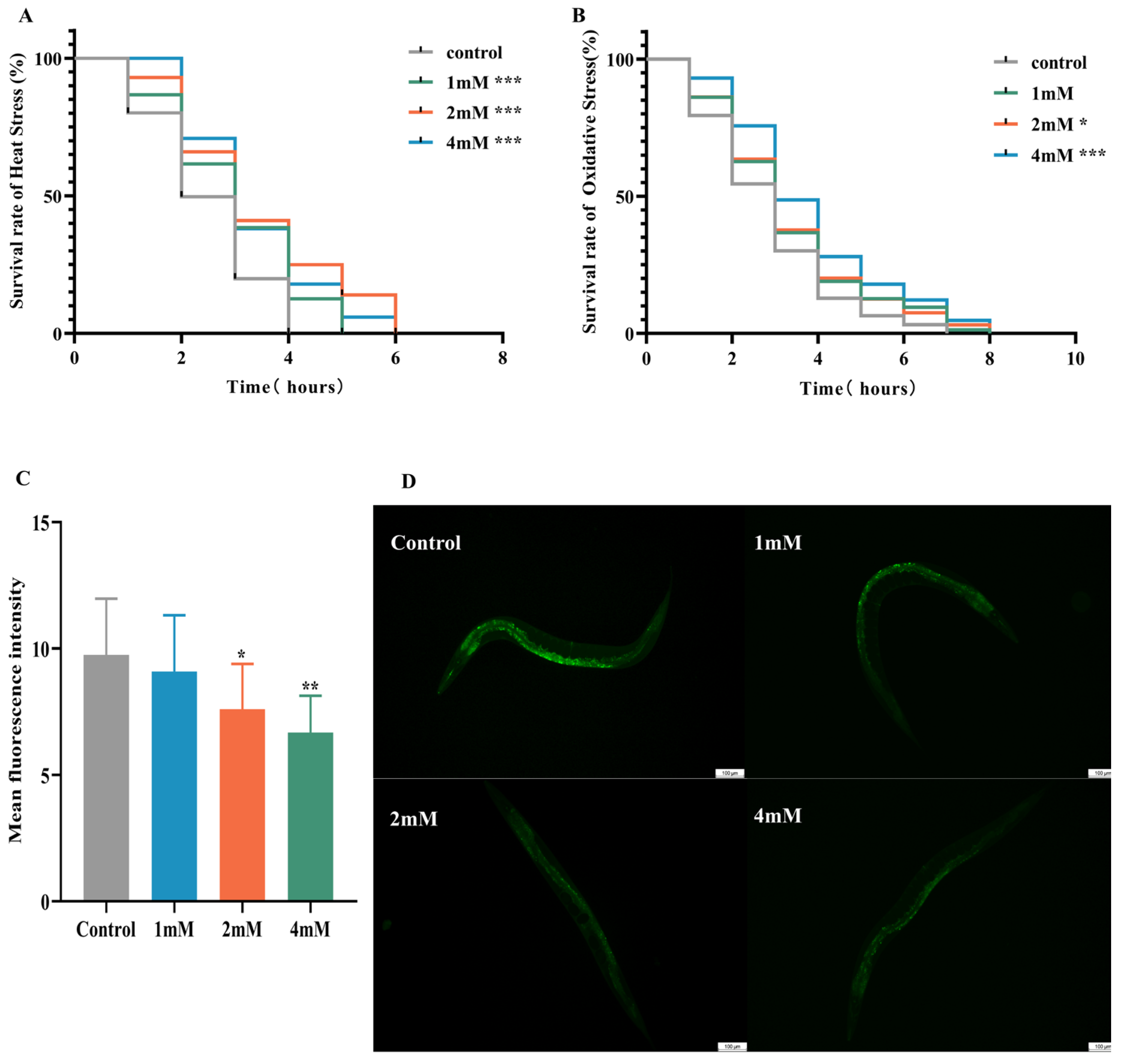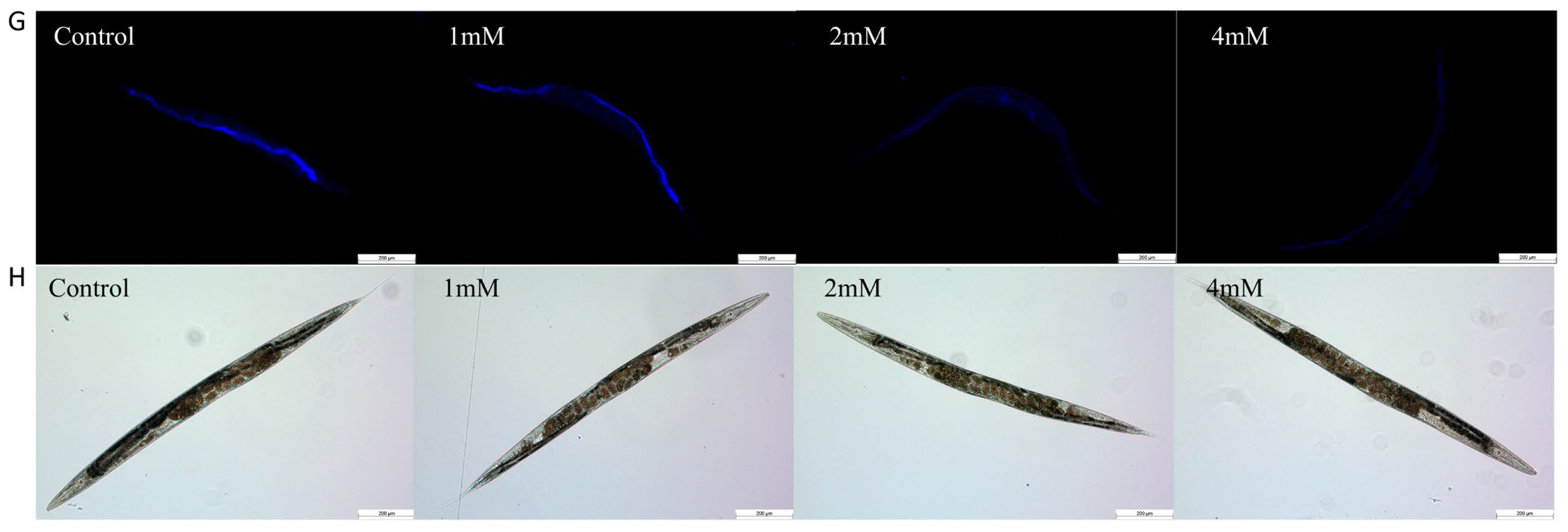 Oxidative Stress: L1-synchronized N2 worms were cultured at 20 °C on plates with different drug concentrations until reaching the L4 stage, after which they were transferred to NGM plates with 300 μM juglone to induce oxidative stress. Each group consisted of three plates with approximately 30 worms each. Survival was assessed hourly until all worms had died. Death was defined by complete body stiffening and unresponsiveness to light and mild vibrations. The experiment was conducted independently on three separate occasions.