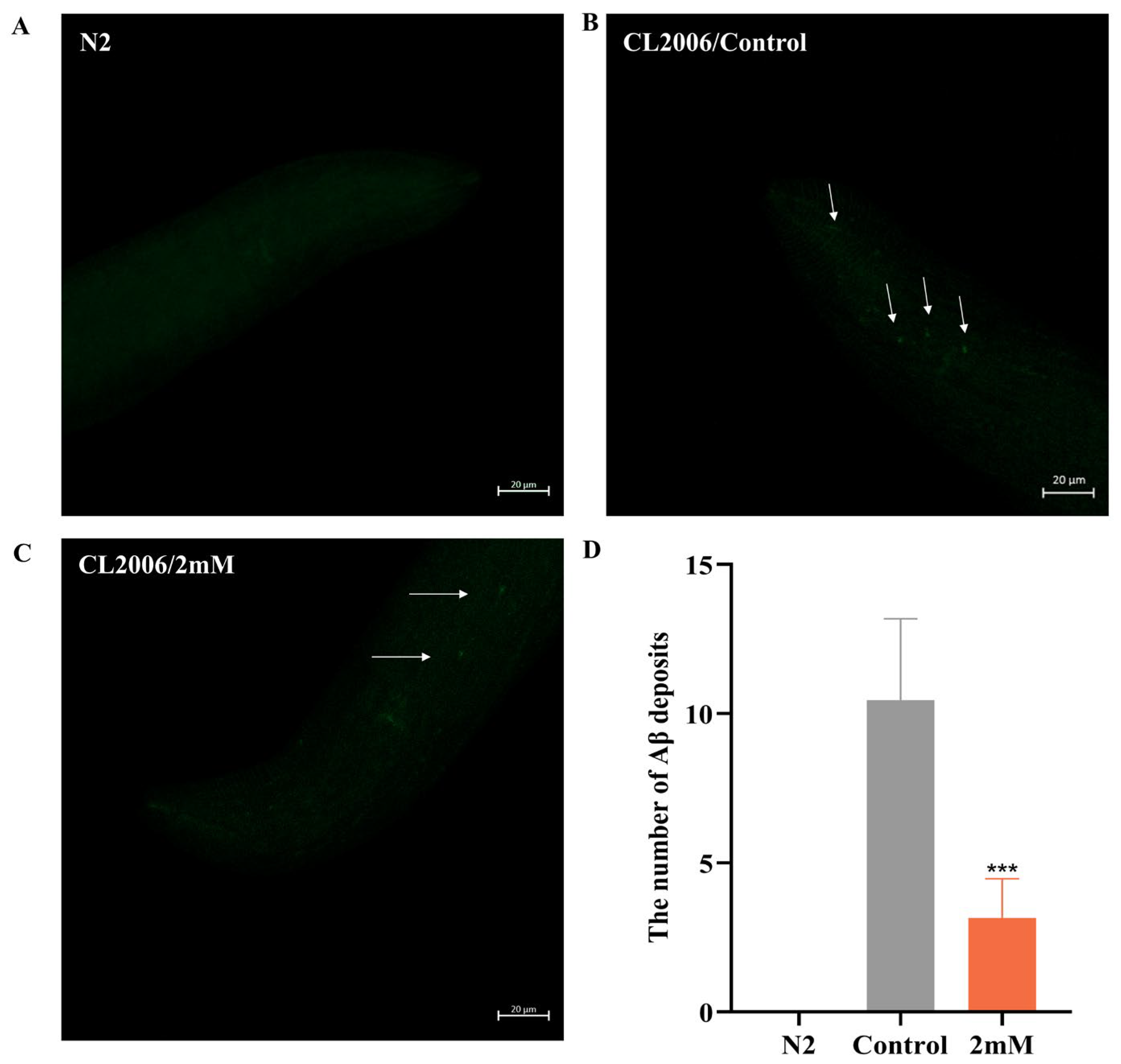 L1-synchronized CL2006 nematodes were cultured on NGM plates with bacterial suspension at 20 °C until reaching the L4 stage. They were then moved to NGM plates with a high, medium or low doses of the drug, or no drug, with three parallel plates per group, each containing about 50 worms. Worms were harvested into Eppendorf (EP) tubes with M9 buffer after two days of cultivation, centrifuged, and repeatedly washed to remove bacteria. Worms were preserved in 1 mL of 4% paraformaldehyde at 4 °C for 24 h. The fixative solution was discarded, and 1 mL of permeabilization solution was added, followed by incubation at 37 °C for 24 h. Following three TBST washes, worms were stained with fluorescent dye thioflavin S at room temperature for 2 min and subsequently decolorized twice with 50% ethanol for 2 min each. Imaging was performed using a confocal laser microscope: worm suspensions were placed on slides and coverslipped, parameters were adjusted, and images were saved, focusing on the head region, specifically the anterior pharynx, to observe Aβ protein deposition.