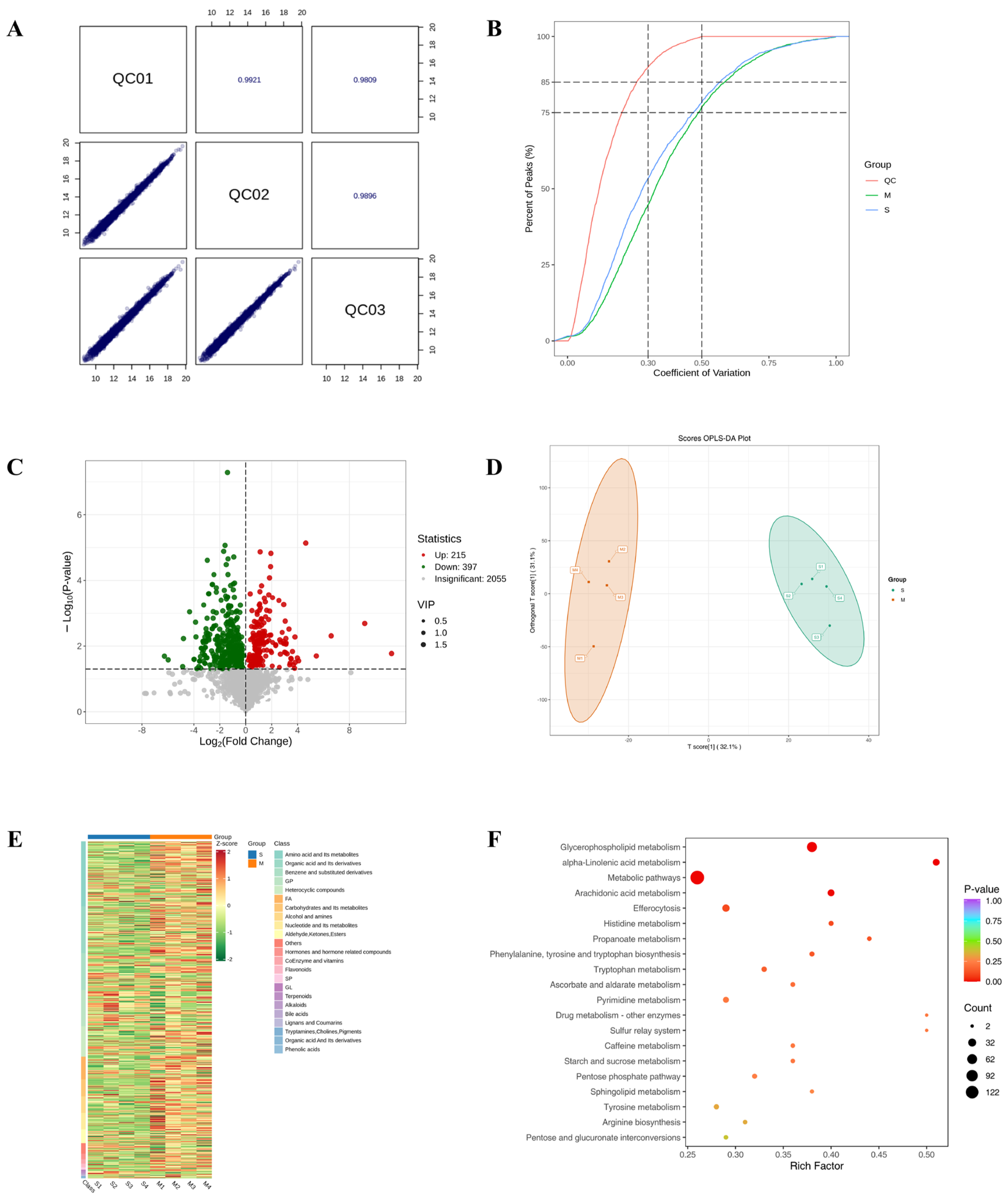 Synchronized L1-stage CL4176 nematodes were cultured on NGM plates with or without 4 mM drug at 16 °C for 48 h, followed by a temperature shift to 25 °C for approximately 30 h. The worms were then harvested in M9 buffer, washed 2–3 times with sterile water, snap-frozen in liquid nitrogen, and stored at −80 °C for subsequent sequencing. For metabolite extraction, thawed samples were homogenized in a ball mill with stainless steel beads at 30 Hz and extracted with ice-cold 70% aqueous methanol at 4 °C prior to analysis. Non-targeted metabolomics was initially conducted to identify metabolites, which were subsequently matched with the Metware Internal Metabolite Database (MWDB) for comprehensive TM analysis. Metabolomic differences were assessed using ultra-high-performance liquid chromatography-tandem mass spectrometry (UPLC-MS/MS) alongside internal databases and multivariate statistical analysis. We acquired untargeted metabolomic data using on an UPLC-TripleTOF 6600 QTOF system (AB SCIEX, Framingham, MA, USA) and targeted data using on an UPLC-Q-Trap system. A pooled QC sample was injected periodically to ensure data quality. Compound annotation was achieved by comparing the acquired MS/MS spectra and retention times from the LC-QTOF-MS/MS analyses against integrated commercial (MWDB and its AI library) and public databases (Metlin, HMDB, KEGG). Metabolites were considered differential if they had a VIP score greater than 1 and a p-value less than 0.05.