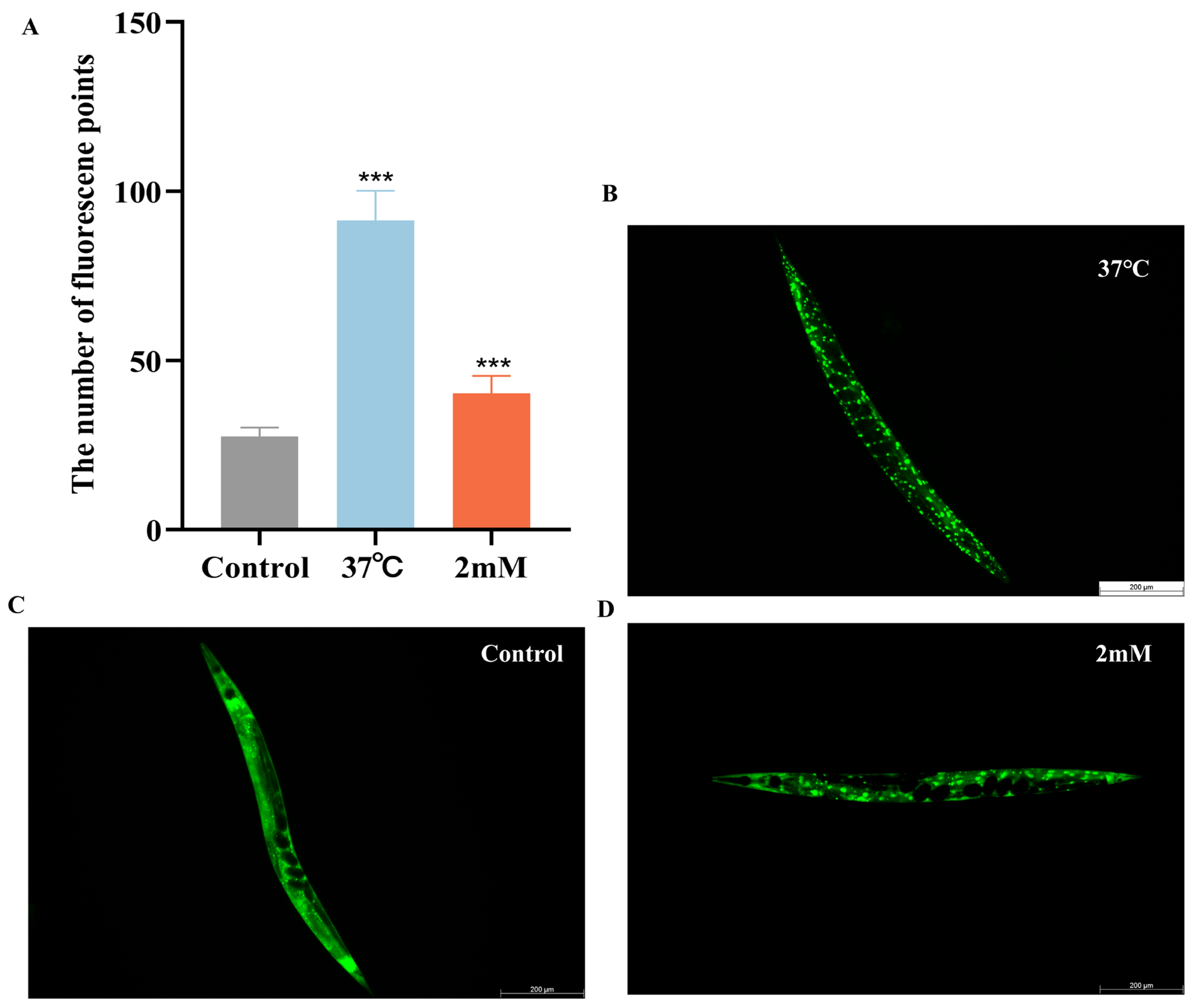 Heat Stress: Following the placement of synchronized L1 wild-type N2 worms on drug-containing or control NGM plates (three replicates per group, 30 worms each), the cultures were maintained at 20 °C for two days prior to a temperature upshift to 37 °C, where their survival was observed hourly until mortality was complete. The experiment was conducted independently on three separate occasions.