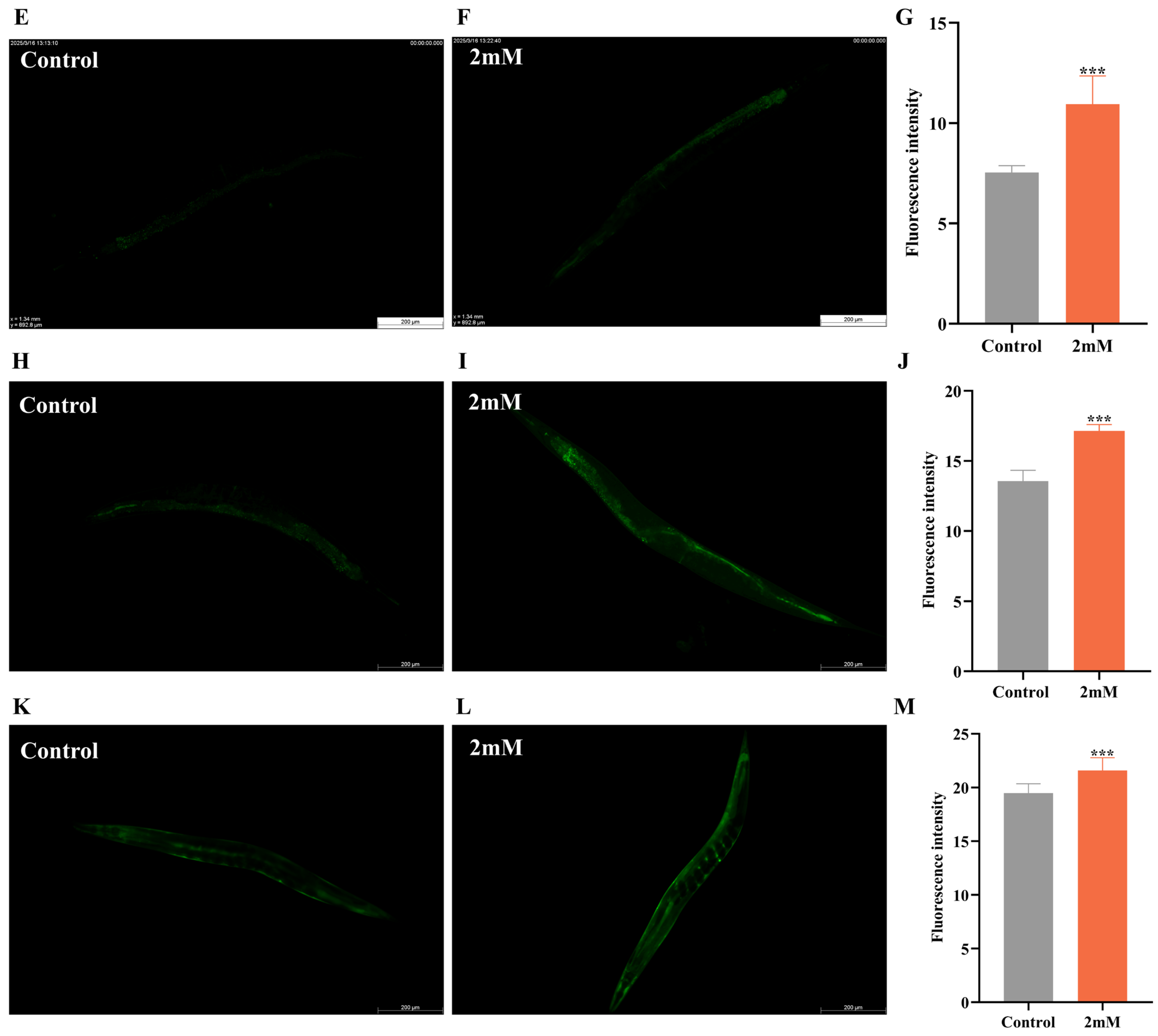 50]. The whole-body fluorescence intensity of SOD-3::GFP and GST-4::GFP was quantified in the CF1553 and CL2166 strains, employing three independent replicates with a minimum of 10 worms per group.