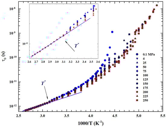 The general validity of this universal-like crossover is confirmed by the rotational relaxation time data, , at different temperatures and pressures reported in an Arrhenius plot in Figure 6. Temperature data are considered from the boiling point down to 185 K for many pressures, as indicated in the legend from to 250 MPa.