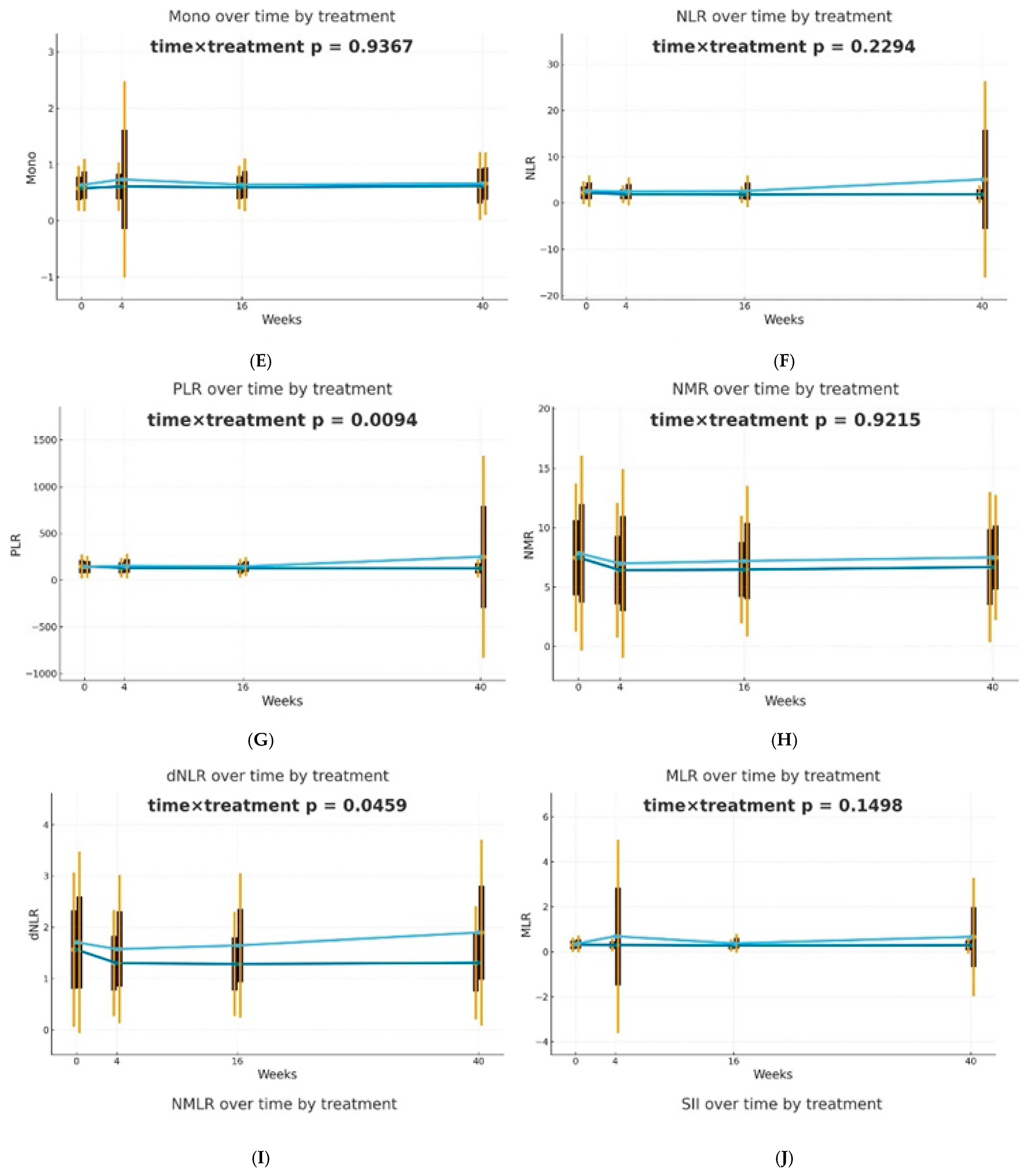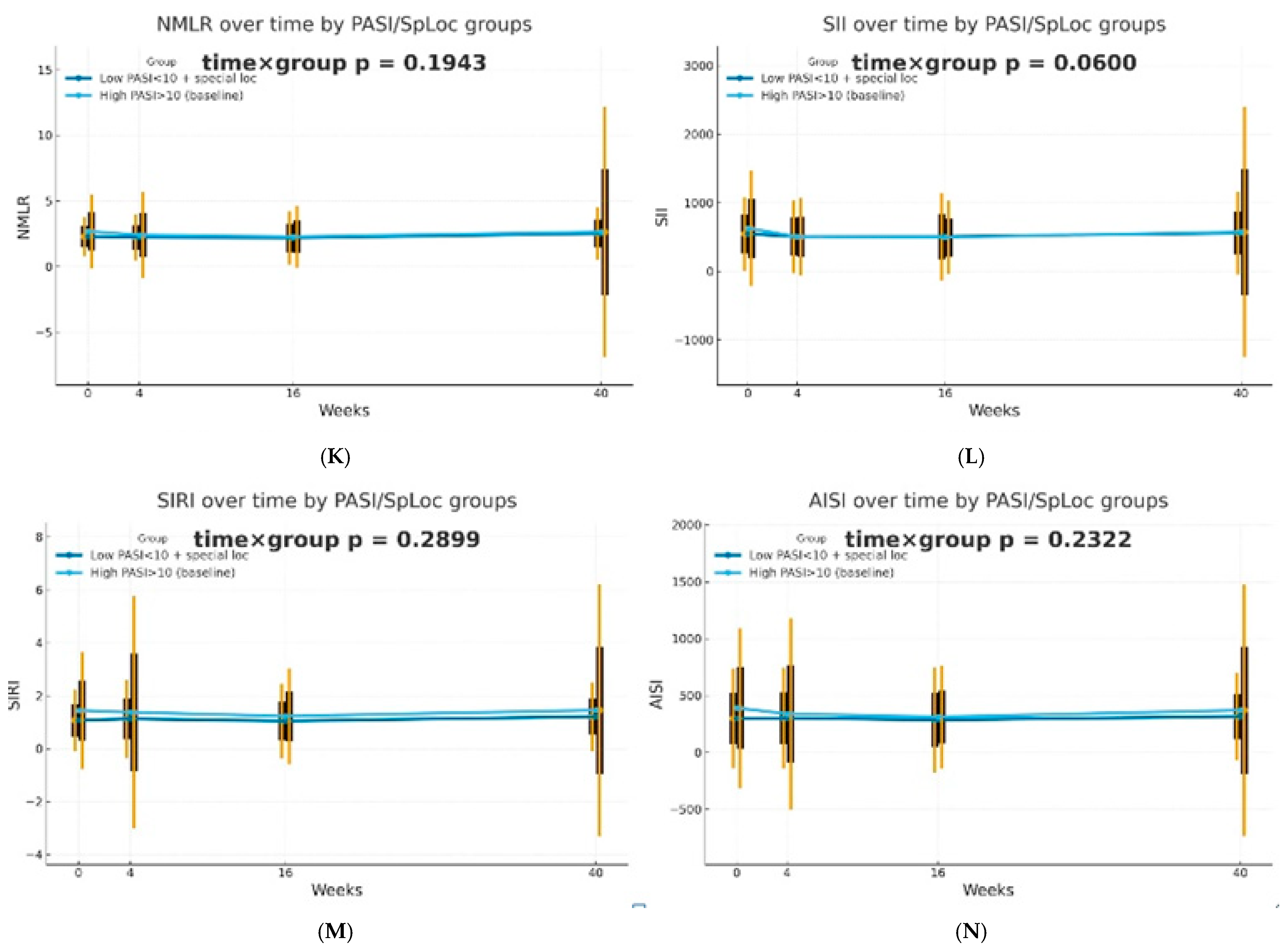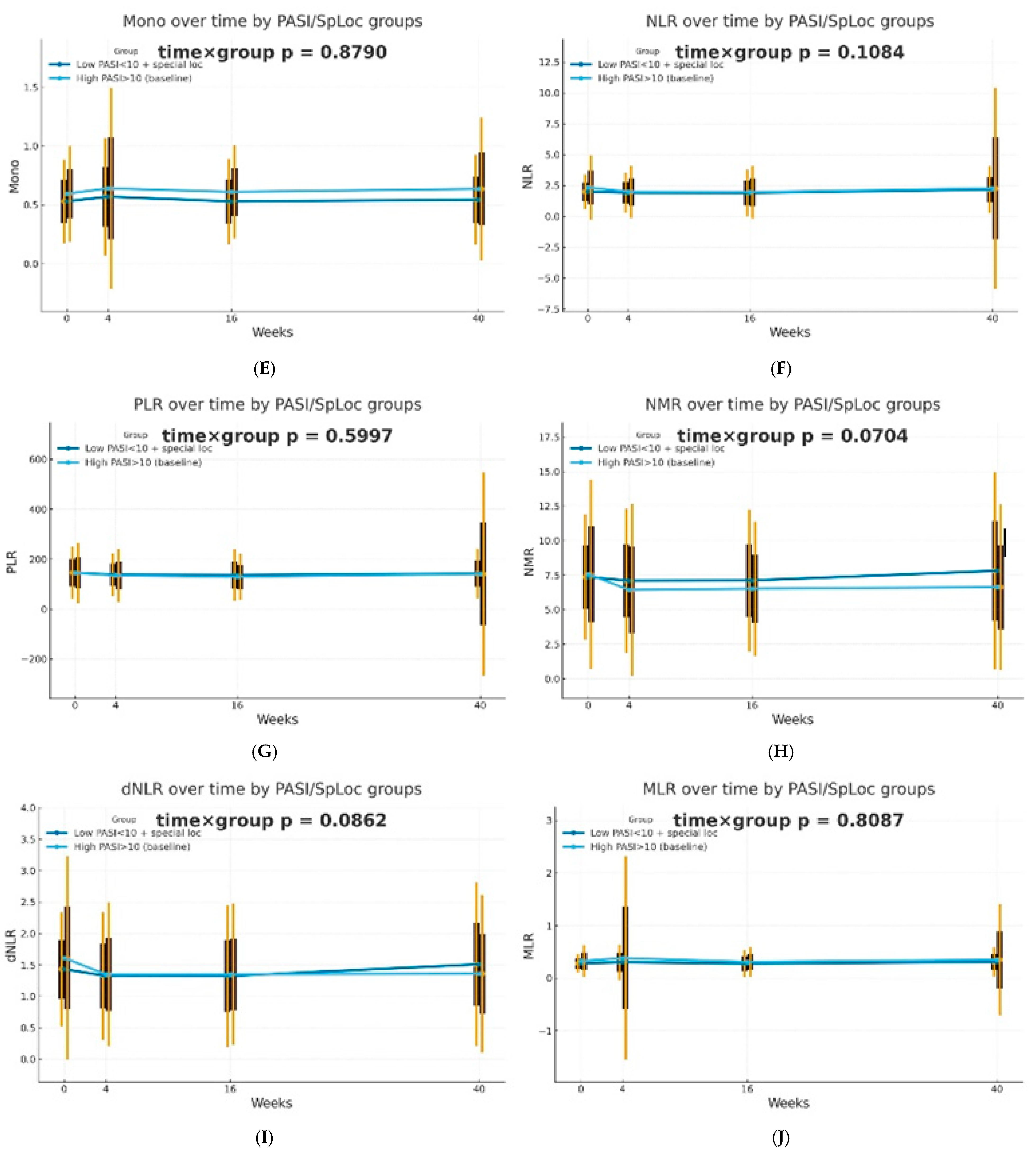 | Albayrak H. [15] | adalimumab, etanercept, and infliximab; the IL-17A antagonists ustekinumab, secukinumab, and ixekizumab; and acitretin and methotrexate | NLR, NMR, PLR, and SII | 0/3/6 months |