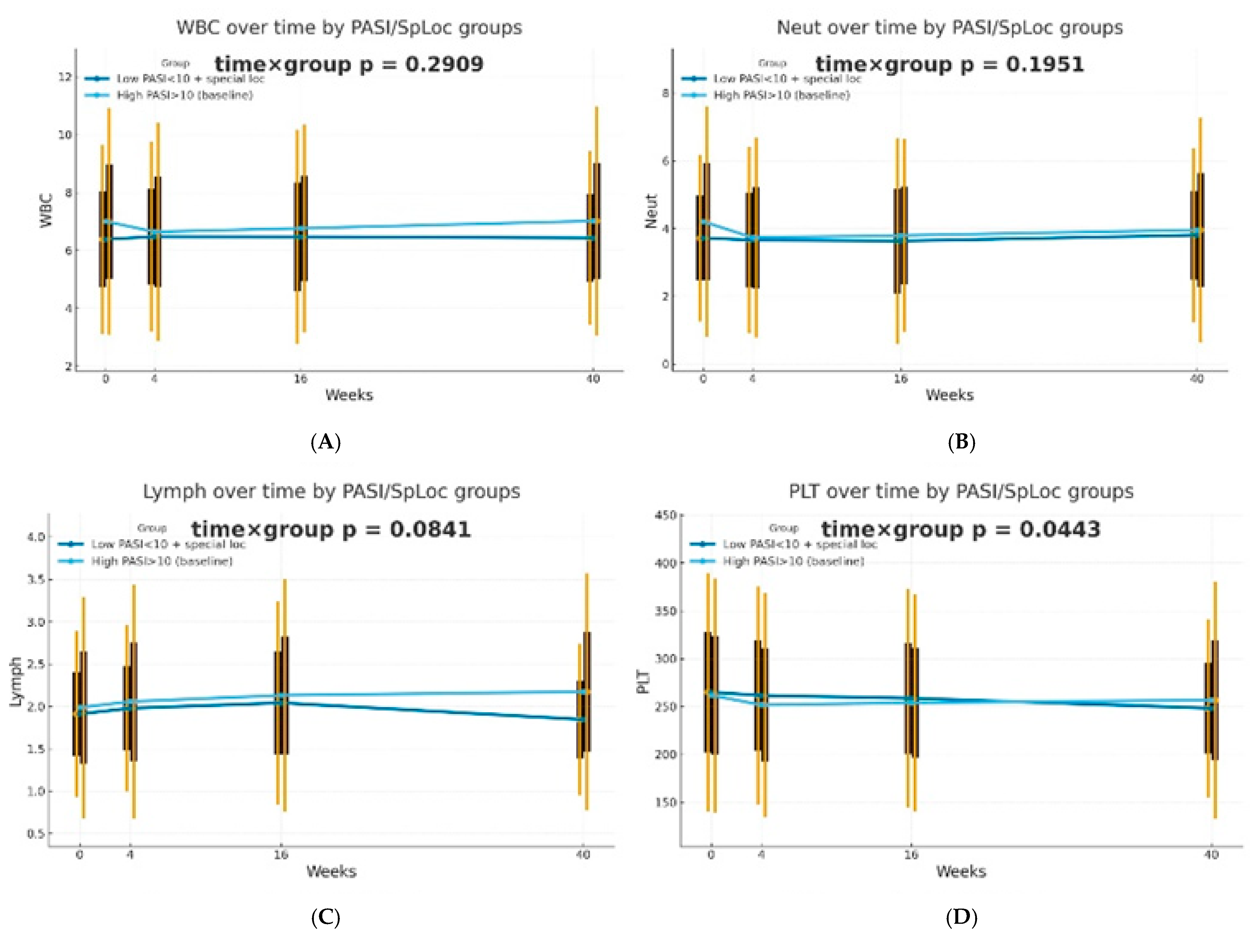 | Şener G et al. [21] | acitretin, cyclosporine, methotrexate, adalimumab, ustekinumab, risankizumab, guselkumab, secukinumab, ixekizumab | WBC, RBC, MCV, MCH, MCHC, PLT, PCT, neutrophil, lymphocyte, monocytes, basophil, RDW, NLR, MLR, PLR | 0/3 months |