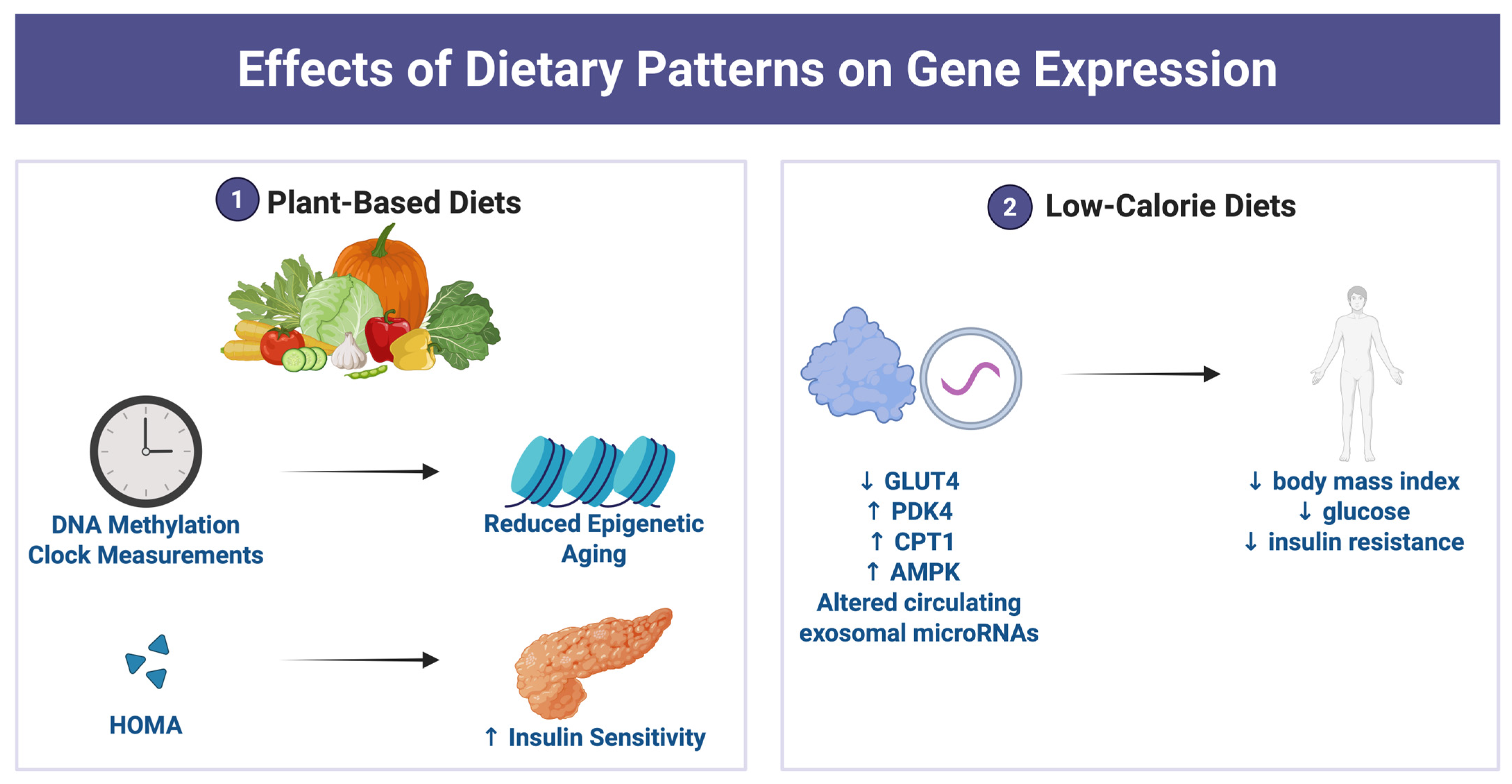 | Vegan/plant-based diet; nucleotides | DNA methylation clocks | Multiple epigenetic clocks (Hannum, Horvath, etc.) | Reduced epigenetic age and improved insulin sensitivity |