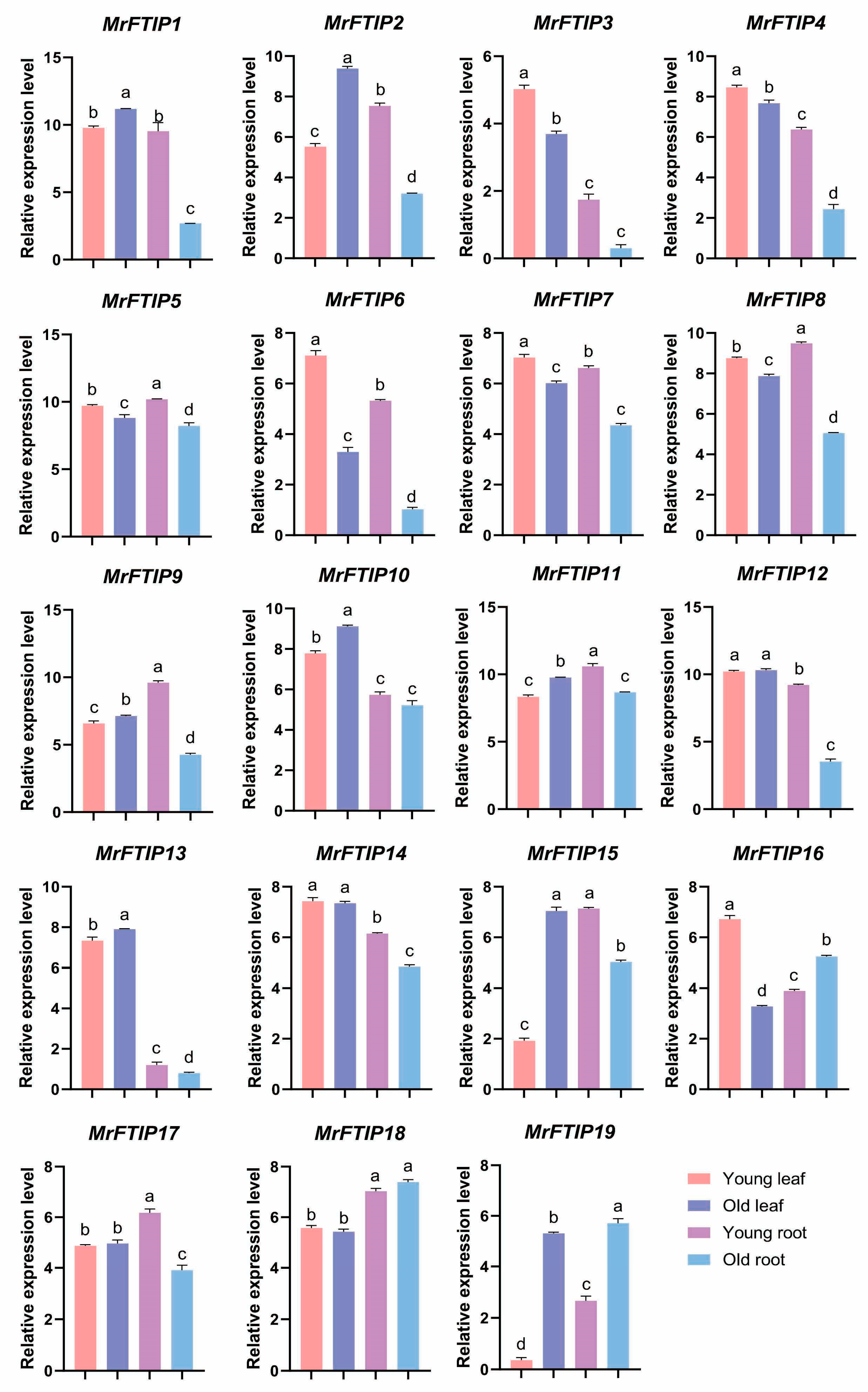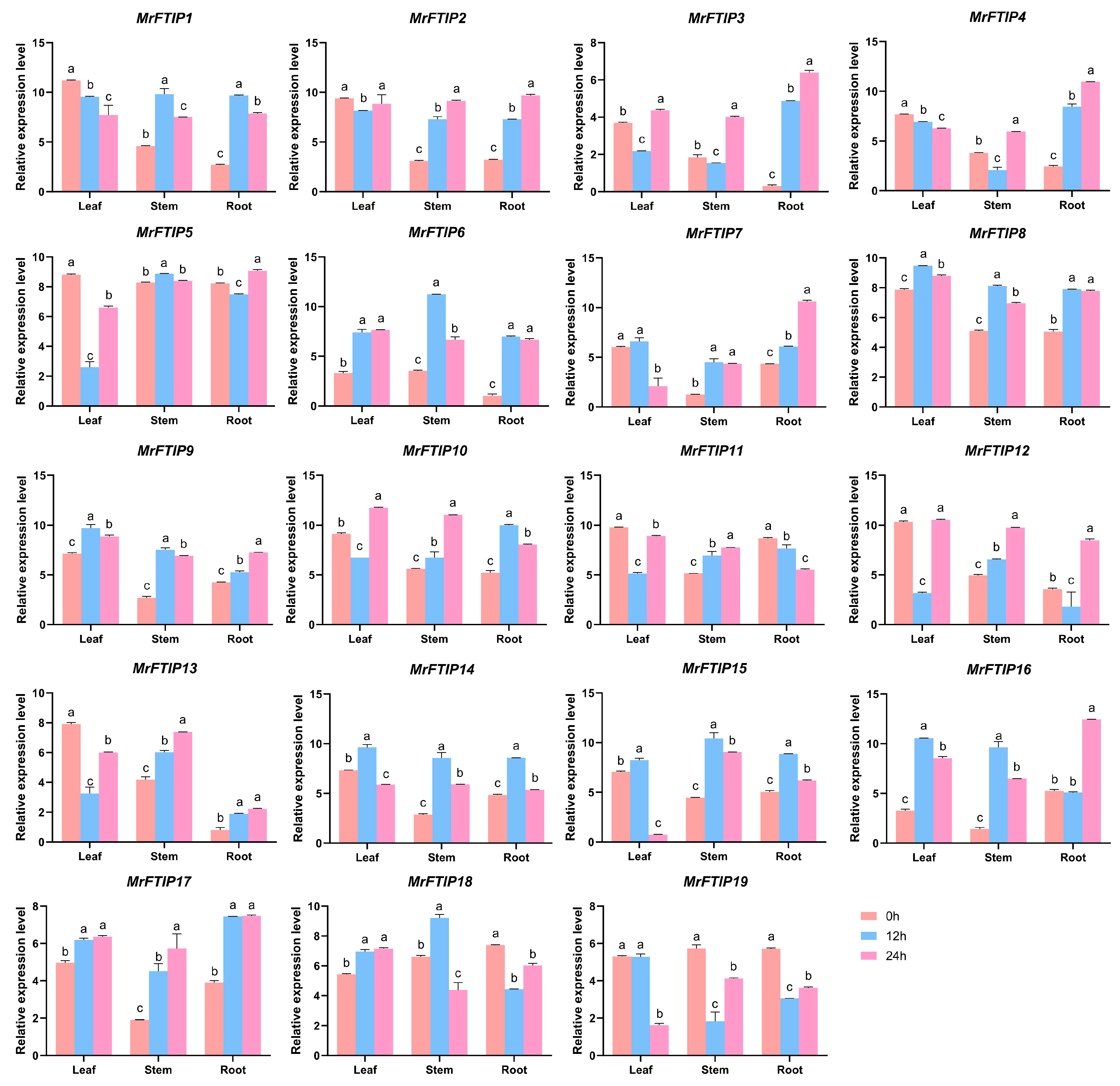 4.7. Plant Material Treatment and Expression Analysis of MrFTIPs