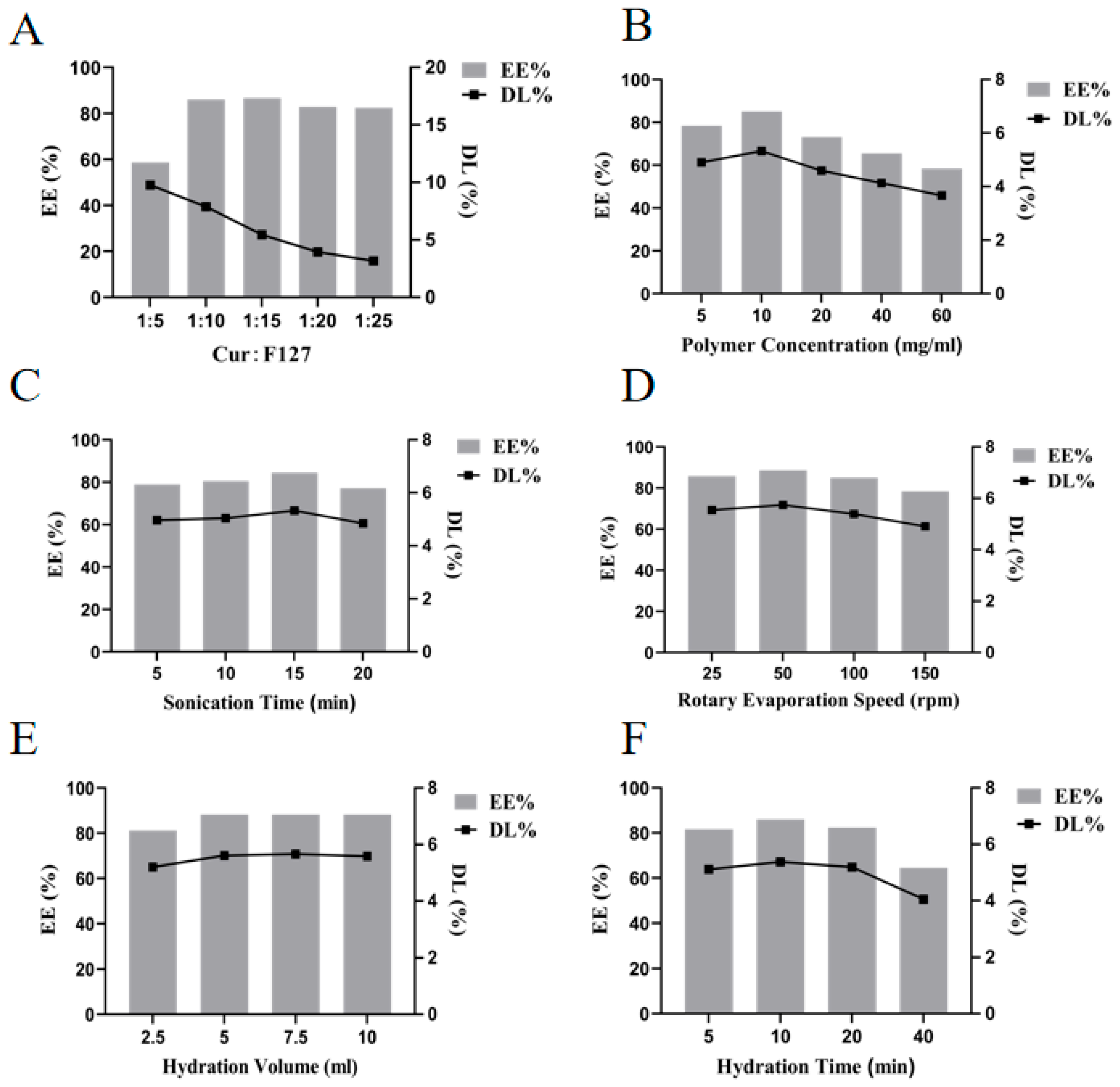 First, drug-to-excipient ratio, mass concentration of carrier material, ultrasonic time, rotational evaporation rate, hydration volume, and hydration time were investigated as single factors. The goal was to identify the parameter ranges that significantly impact EE% and DL%.