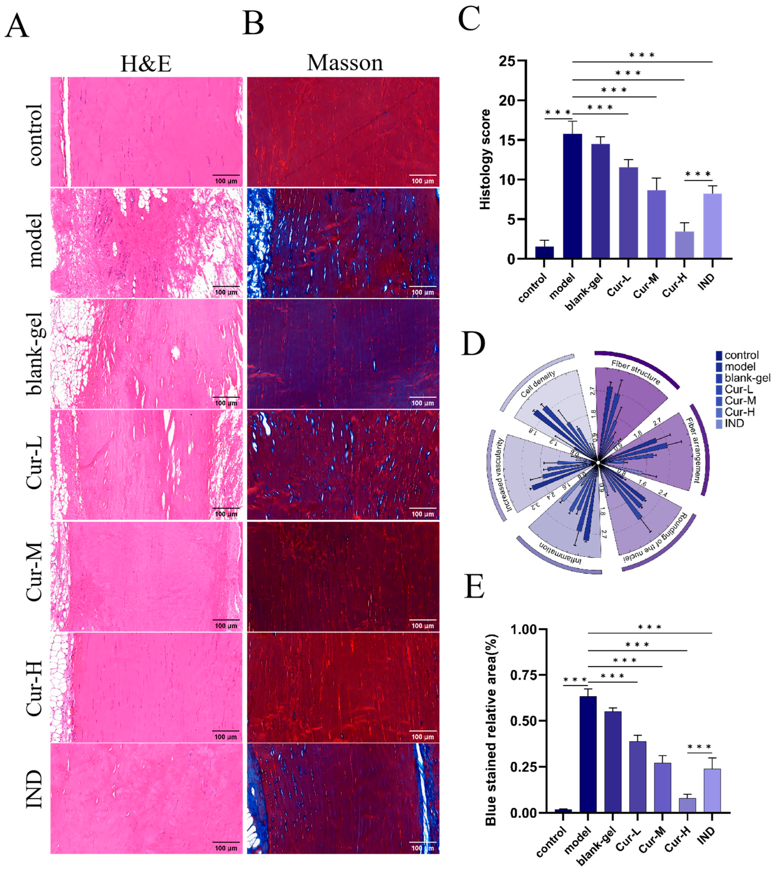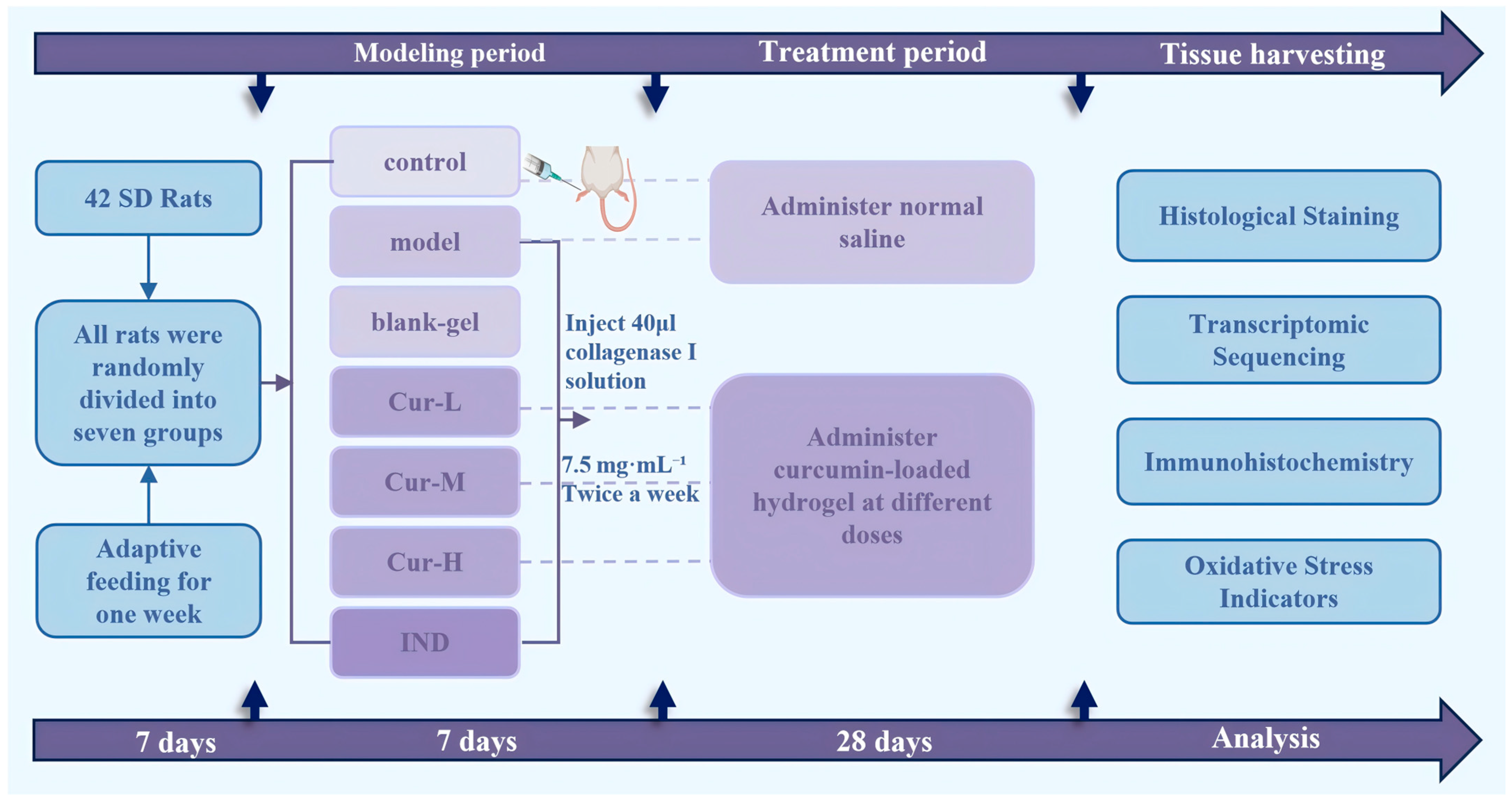 All SD rats were housed in a standard laboratory environment with temperature maintained at 23 ± 3 °C, humidity at 50 ± 5%, and a 12 h light/dark cycle. They had free access to water and were provided with standard laboratory chow. After 7 days of acclimatization, the rats were randomly divided into seven groups (n = 6 per group): control group, model group, blank hydrogel (blank-gel) group, Cur-F127&gel hydrogel treatment groups: low-dose group (Cur-L), medium-dose group (Cur-M), and high-dose group (Cur-H) and the positive control (IND) group. Except for the control group, the Achilles tendons of both hind limbs in the remaining six groups were disinfected with iodophor. A 30-G needle attached to a micro-syringe was inserted vertically into the tendon–bone junction until resistance was felt. The needle was then redirected to align parallel to the tendon axis, and 40 μL of collagenase I solution (7.5 mg·mL−1) was injected slowly along the distal portion of the Achilles tendon while withdrawing the needle. After injection, the puncture site was again disinfected with iodophor. The rats were returned to their cages and maintained under standard conditions for one week before the initiation of treatment.