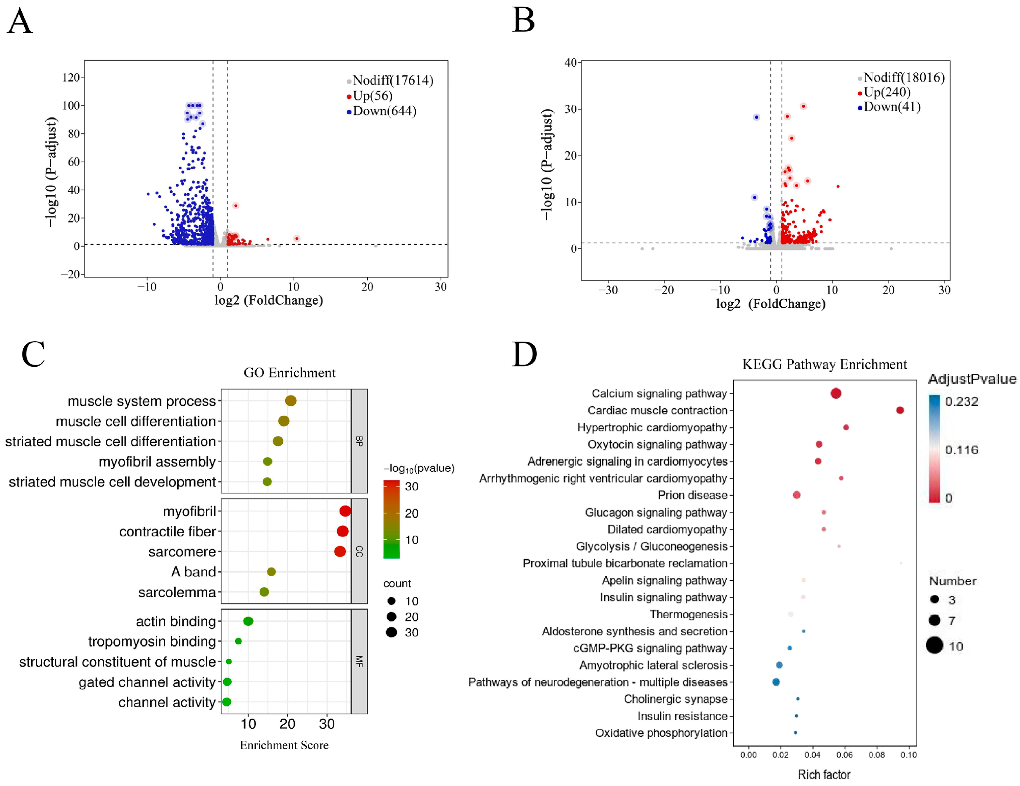 GO function was performed to identify significantly over-represented biological processes, molecular functions, and cellular components among the DEGs. All annotated genes were mapped to GO terms, and a hypergeometric test was applied to determine terms significantly enriched with DEGs relative to the whole genome background. KEGG pathway analysis was conducted to delineate the major metabolic and signaling pathways involving the DEGs. Enrichment significance was assessed using the hypergeometric test, and results were evaluated based on the rich factor (the ratio of DEGs mapped to a pathway to the total number of genes annotated to that pathway), the false discovery rate (FDR), and the number of enriched genes in each pathway. A higher rich factor and a lower FDR (closer to 0) indicate stronger pathway enrichment.
