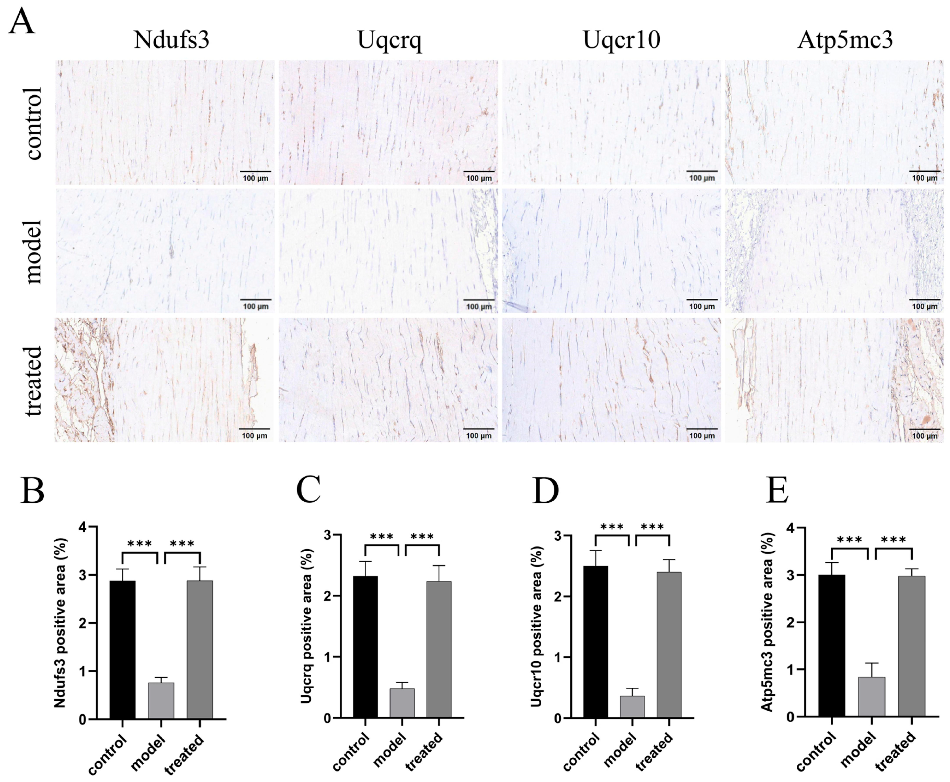 Following deparaffinization and rehydration, Achilles tendon tissue sections underwent antigen retrieval in sodium citrate buffer (pH 6.0) using a microwave heating method. Endogenous peroxidase was blocked with 3% H2O2 (25 min, room temperature). After blocking with 3% BSA (30 min), sections were incubated overnight at 4 °C with primary antibodies, followed by HRP-conjugated secondary antibodies (50 min, room temperature). Slice was developed with DAB, and nuclei were counterstained with hematoxylin. Sections were dehydrated, cleared, and mounted for bright-field microscopy.