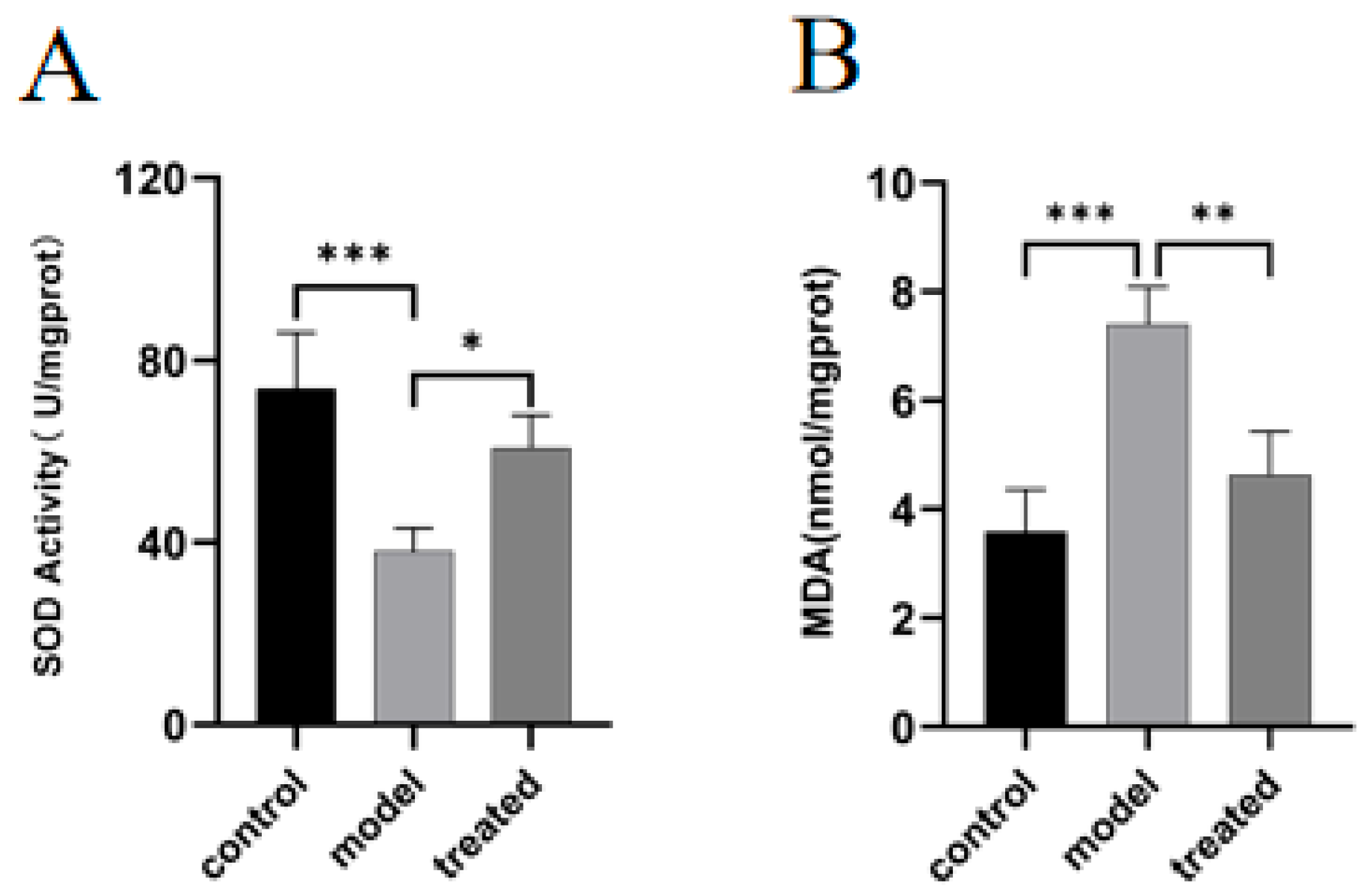 The collected tendon tissues from the control, model, and high-dose treatment groups were weighed and homogenized in ice-cold buffer at a 1:10 (w/v) ratio using a tissue homogenizer. After centrifugation, the supernatant was collected for analysis. The total protein concentration of each sample was quantified using the BCA Protein Assay Kit. Subsequently, the activity of SOD and the content of MDA were measured strictly according to the protocols provided with the respective commercial assay kits. The absorbance value was measured using a microplate reader (SER 33, Molecular Devices, San Jose, CA, USA) at the corresponding wavelength.