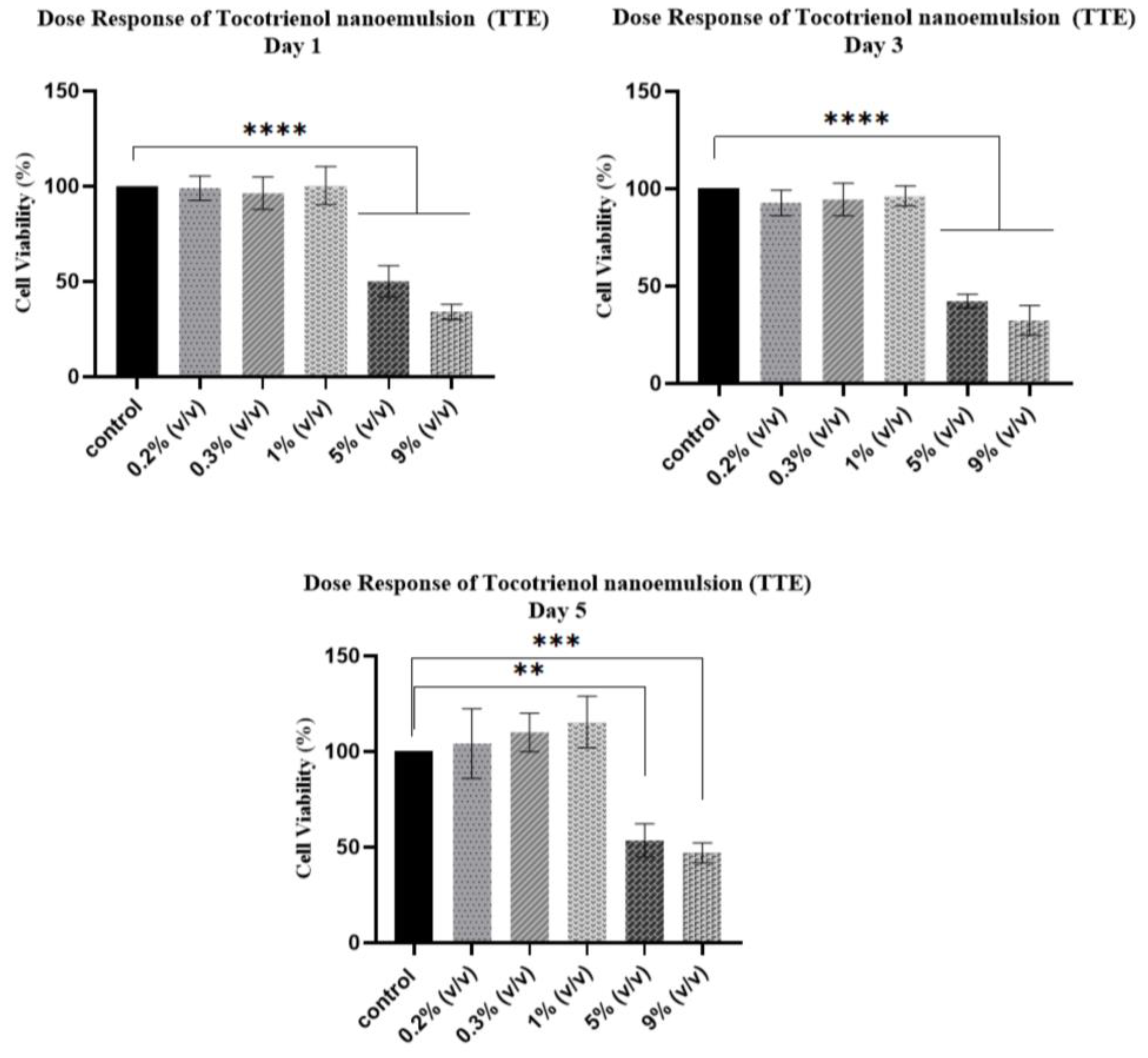 2.2. Dose Response of Tocotrienol Nanoemulsion Study