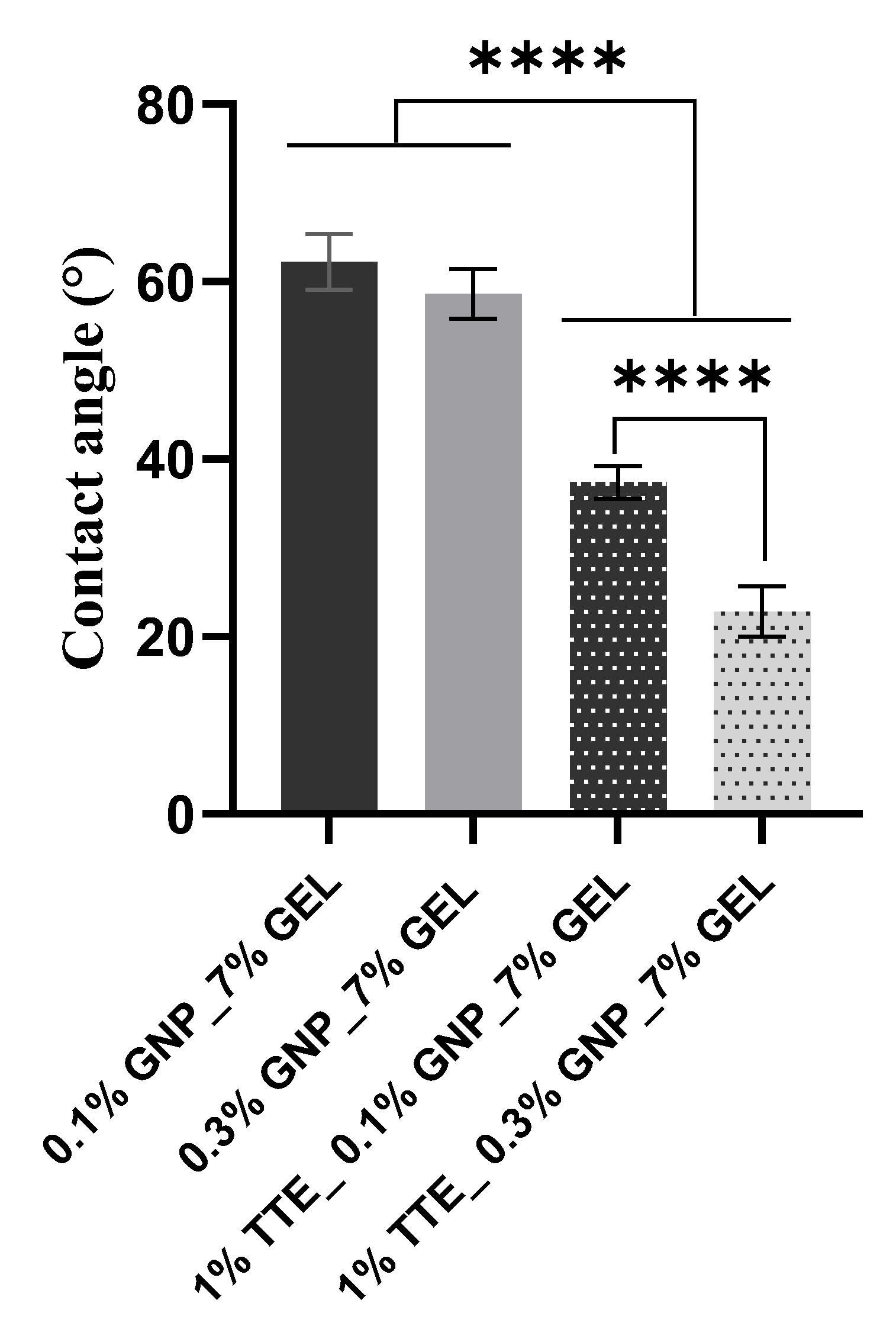 | 1%TTE_0.1%GNP_7% GEL | 65 ± 0.4 | 21.8 ± 0.8 | 11.1 ± 1.7 |