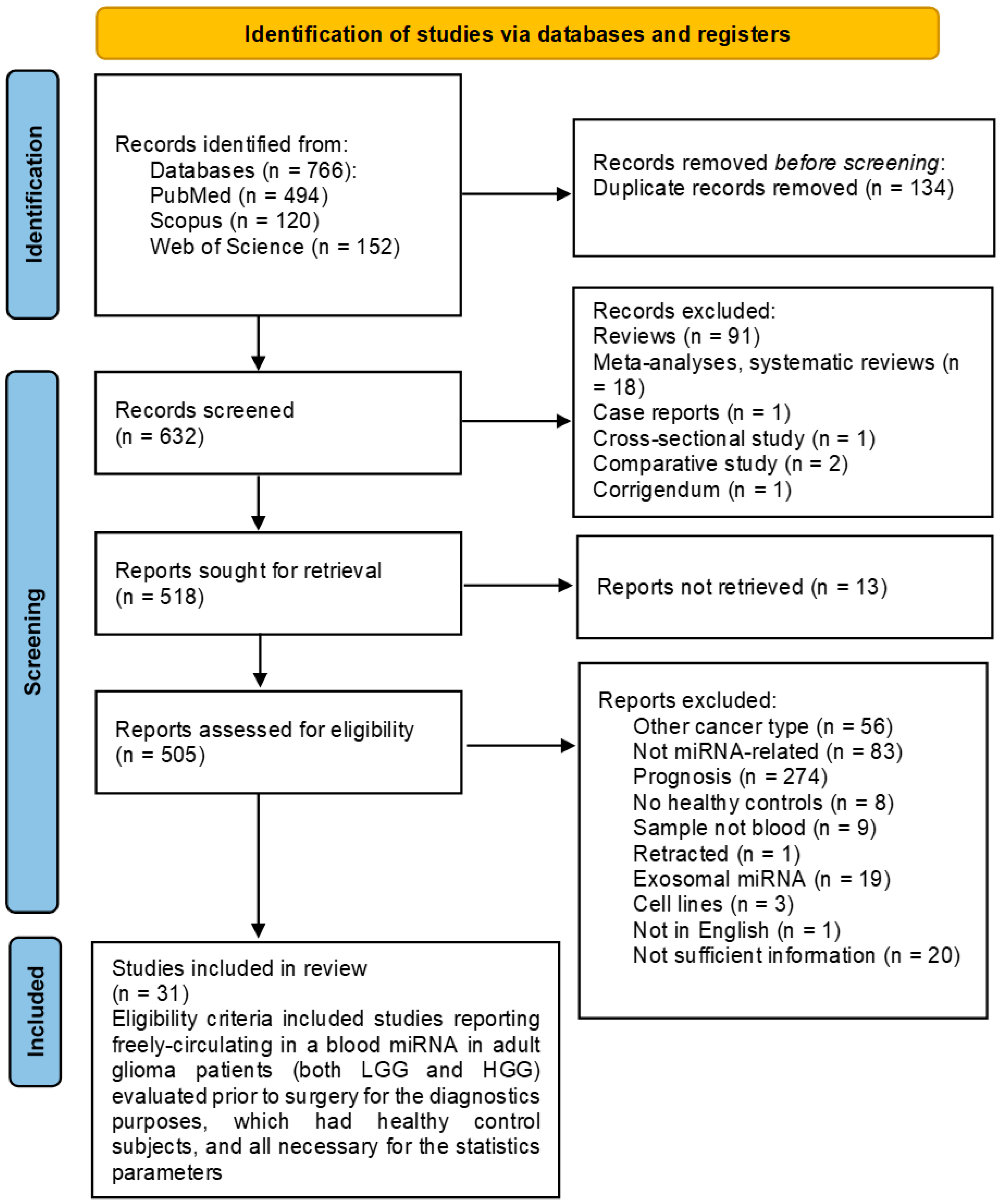 - Studies exploring the diagnostic potential of glioma-associated miRNAs are biased by insufficient disclosure of patient selection criteria and blinding methods in conducting the index test and reference standard for glioma diagnostics;