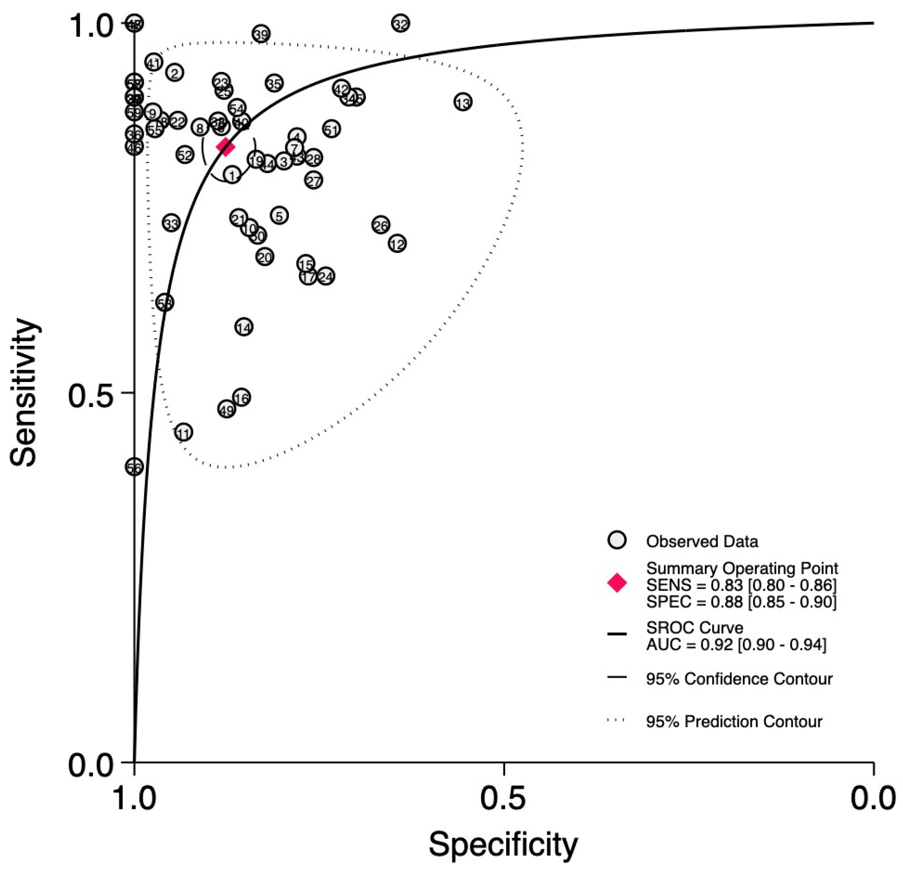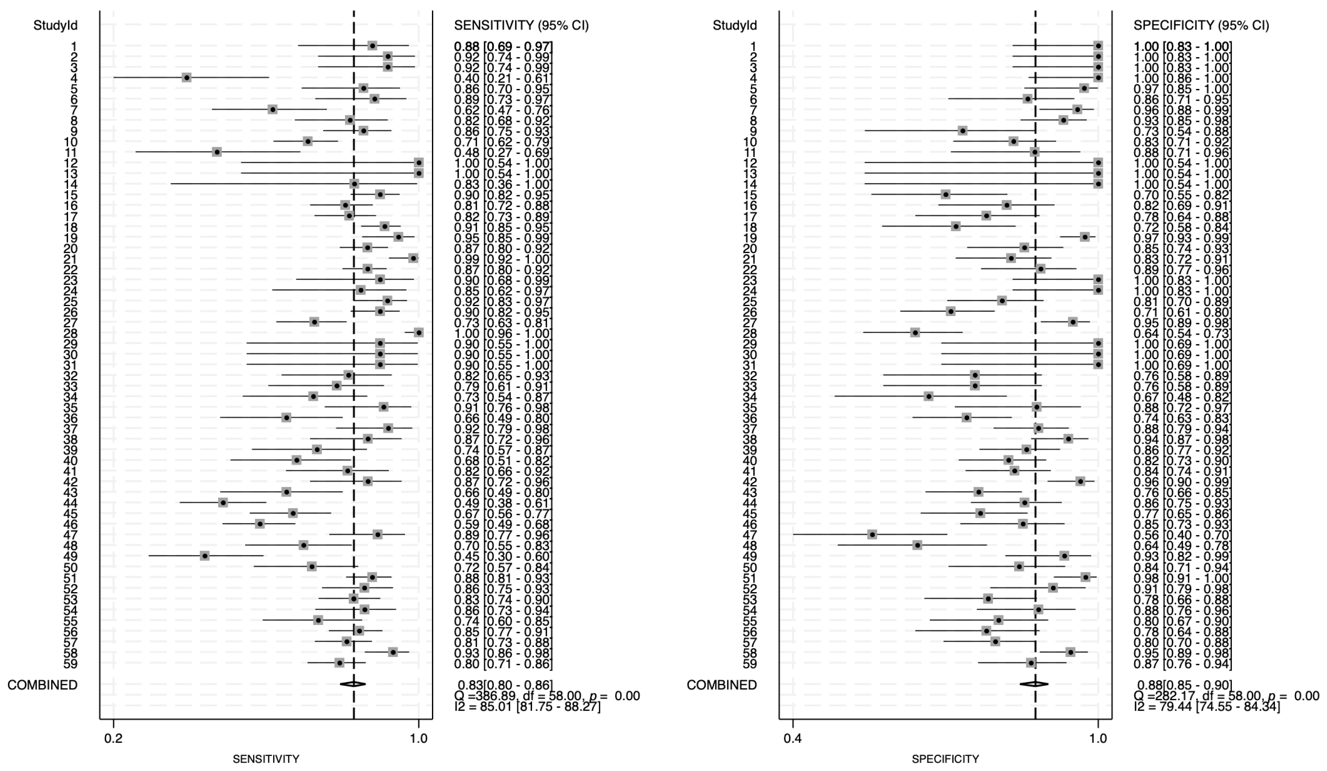 | Asia | 40 | 0.84 [0.79–0.87] | 0.85 [0.81–0.88] | 5.6 [4.4–7.0] | 0.19 [0.15–0.24] | 29 [20–42] | 0.91 [0.88–0.93] |