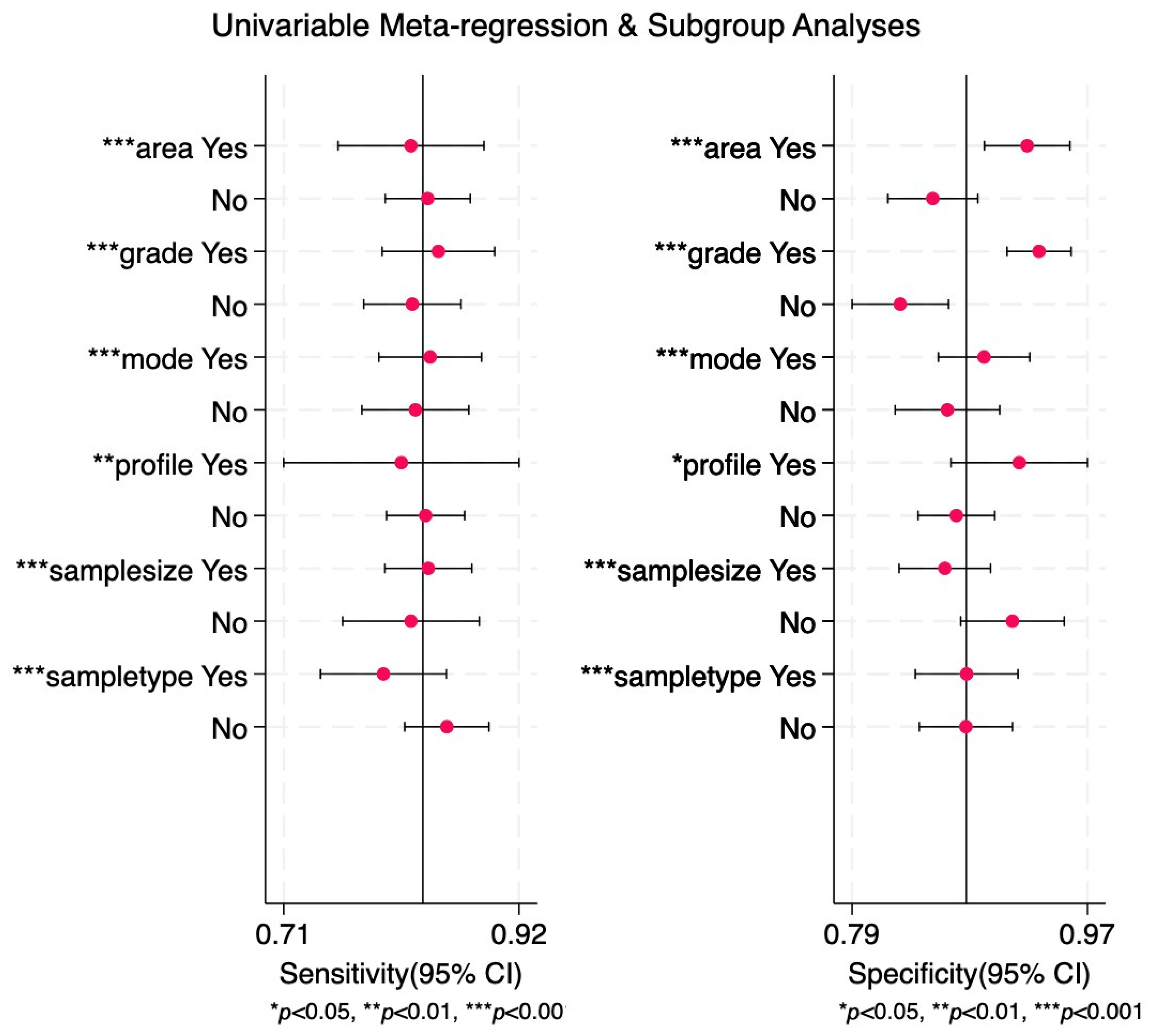 | Subgroups | No. Observations | Sen [95%CI] | Spe [95%CI] | PLR [95%CI] | NLR [95%CI] | DOR [95%CI] | AUC [95%CI] |