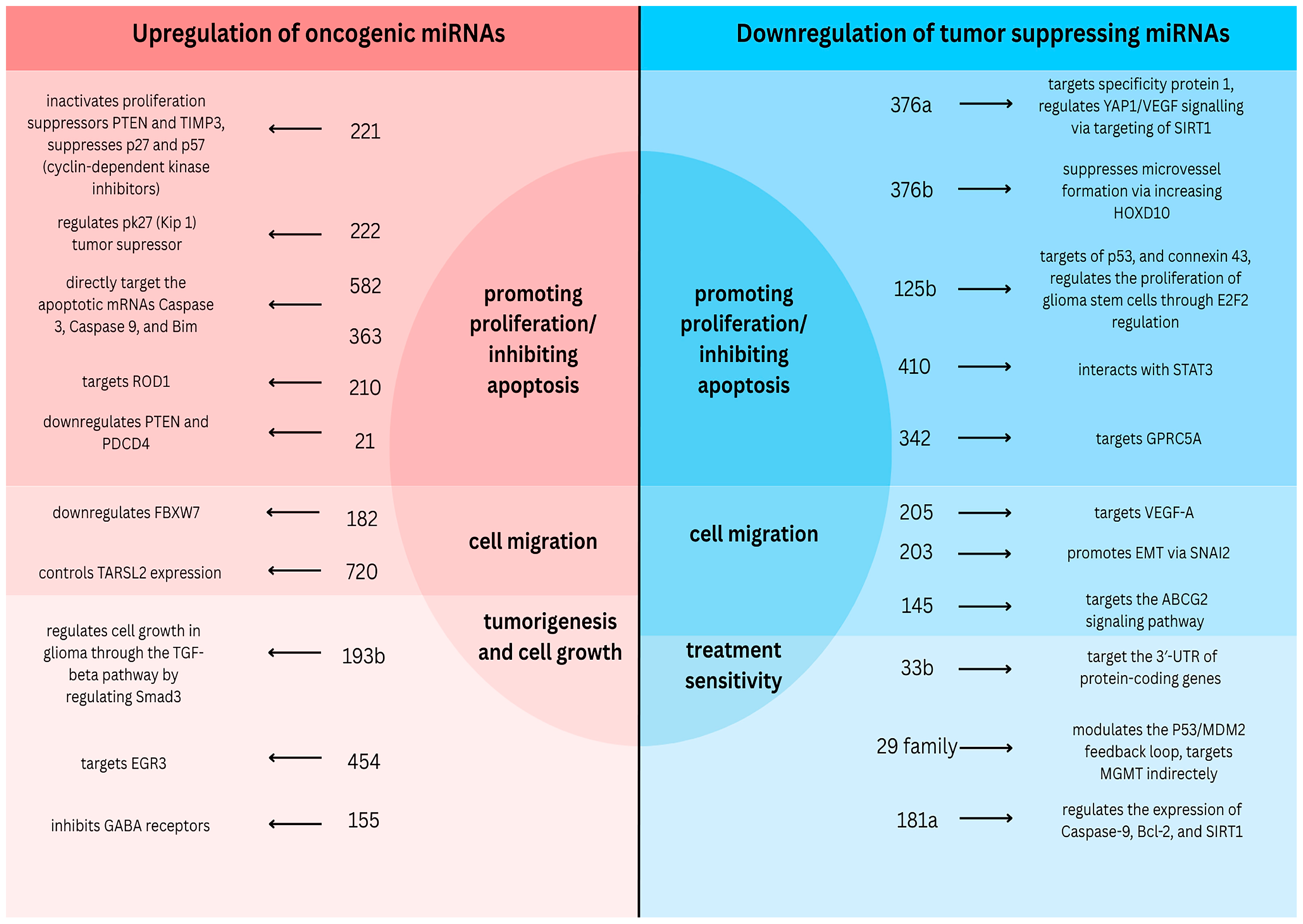 - Oncogenic microRNAs with the suggested mechanisms, such as miR-221, miR-222, miR-582-5p, miR-363, miR-210, miR-21, miR-182, miR-720, miR-193b, miR-454, and miR-155, are upregulated in the blood of glioma patients;
