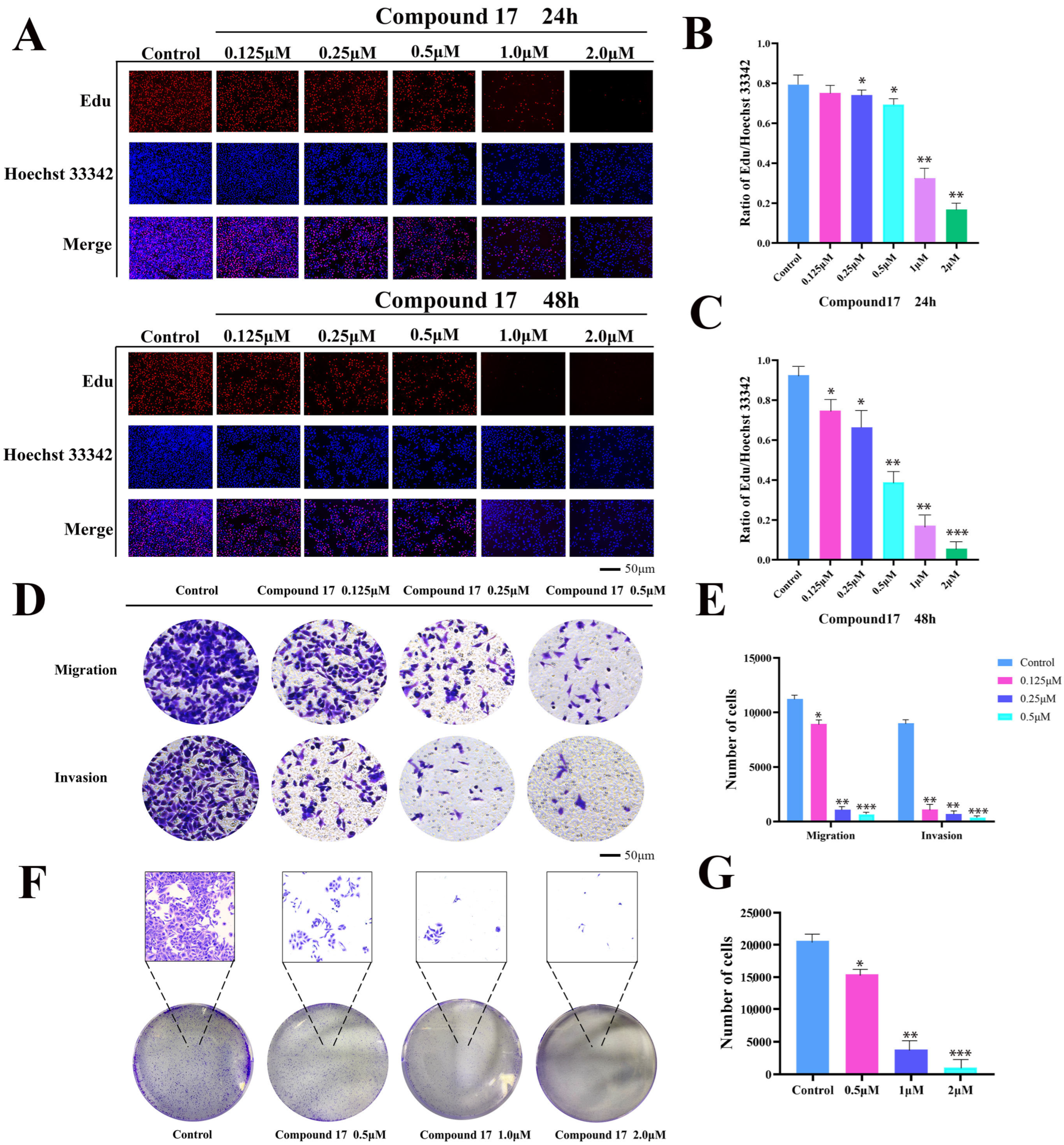 2.3. Compound 17 Suppresses A549 Cell Growth & Proliferation