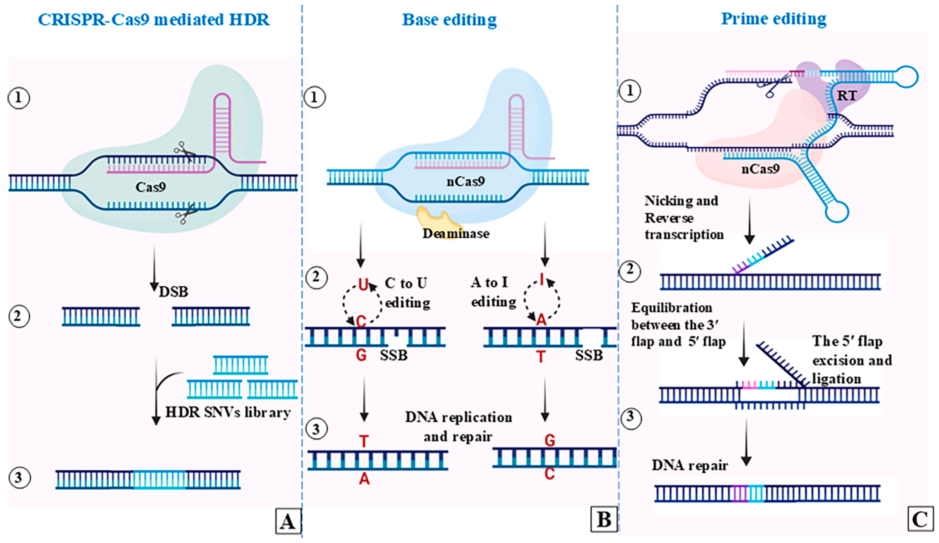 | PE | nCas9 (H840A) + RT+ pegRNA | Uses reverse transcription to directly incorporate new DNA sequences at the target site | Most versatile and precise; without double-strand breaks and donor DNA; enables all 12 base substitutions and small insertions or deletions. |