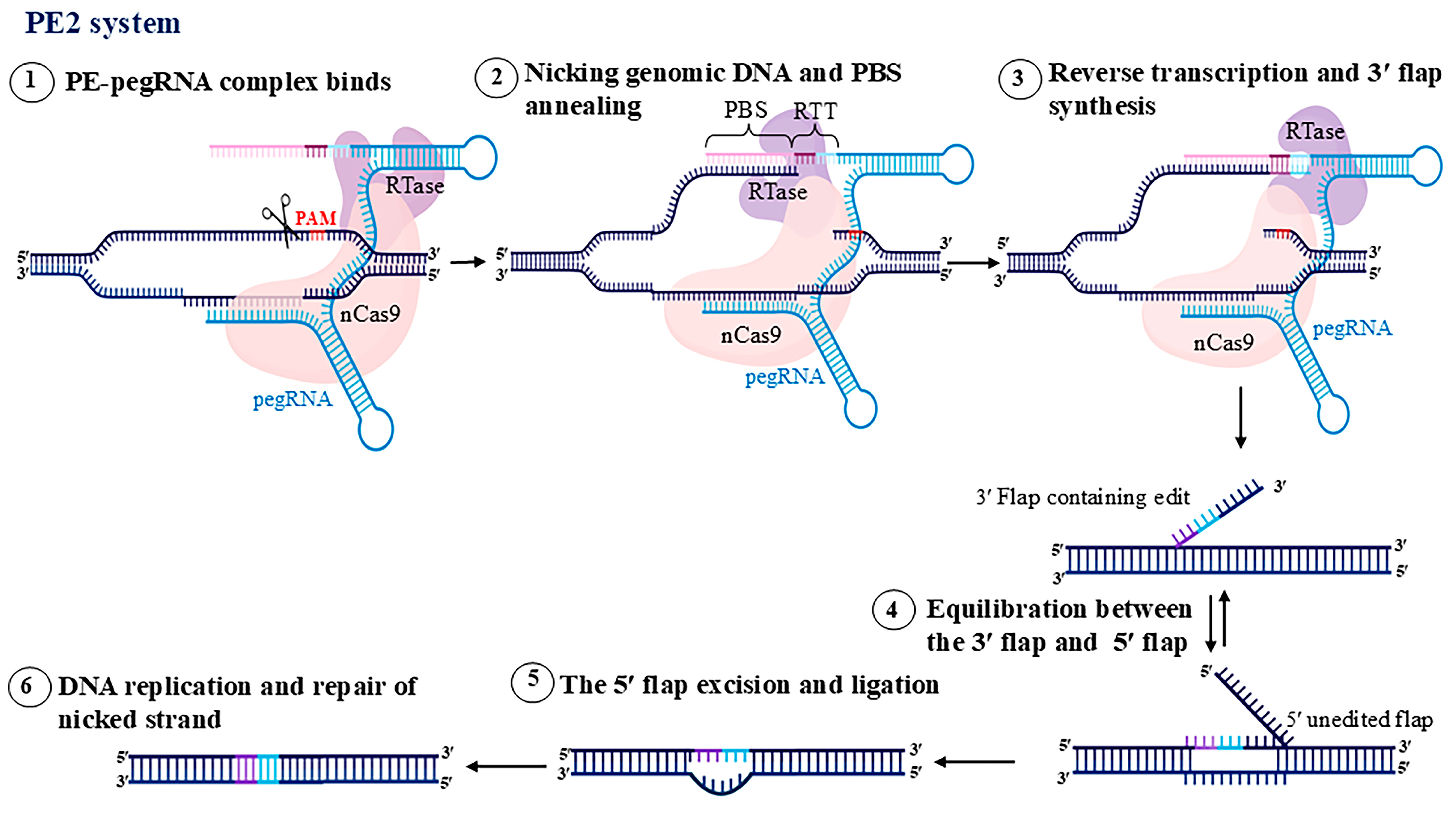 | PE2 | SpCas9 (H840A) nickase + engineered M-MLV RT (mutations D200N, T306K, W313F, T330P, and L603W) | pegRNA (spacer + PBS + RTT) | Moderate (up to ~20–50% for point mutation and deletions) | Improved efficiency. |