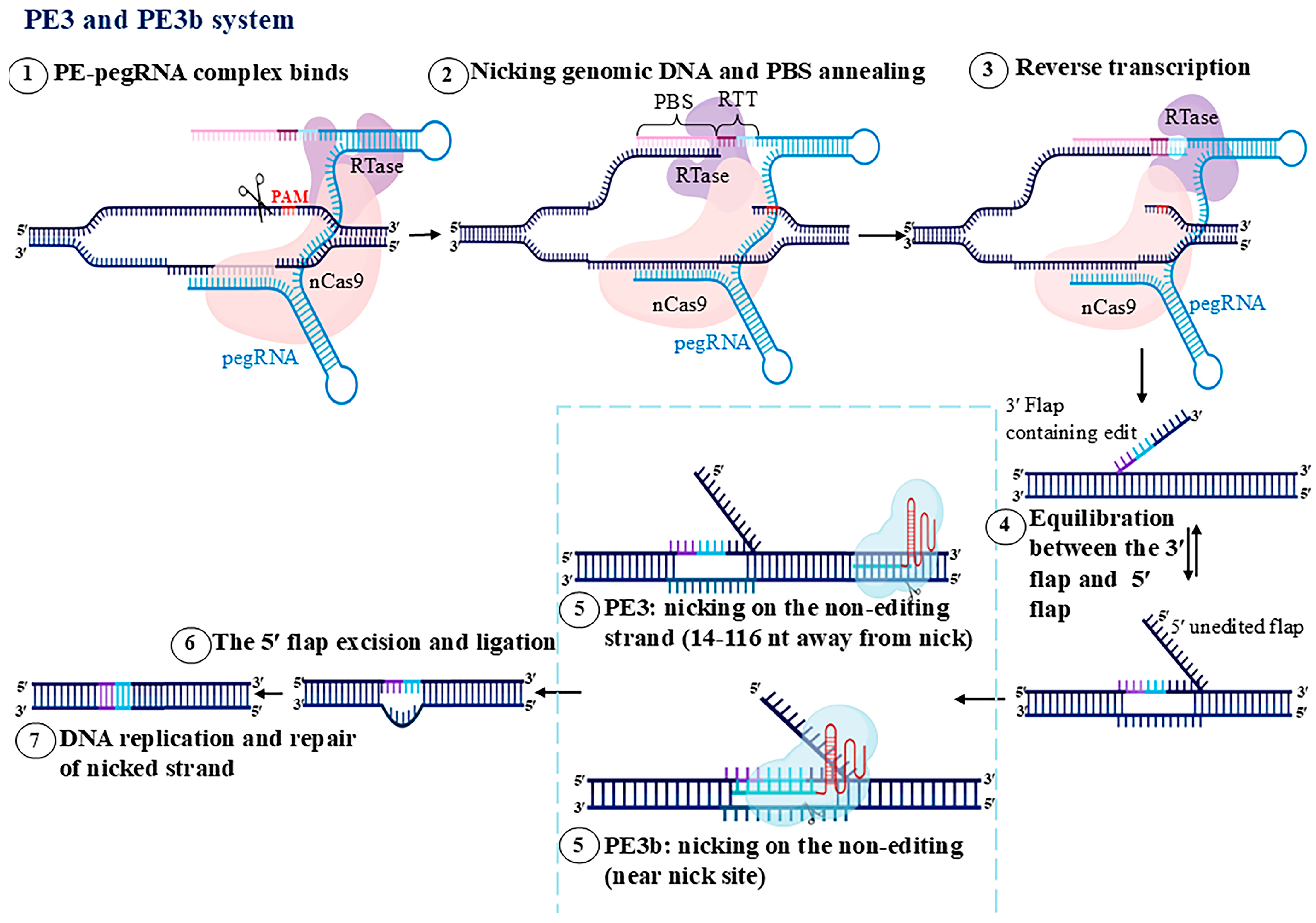 | PE3b | Same as PE2/PE3 | pegRNA + nicking sgRNA (but nicking sgRNA targets only after successful editing) | Moderate to high | Reduces indel formation compared to PE3; enhances precision. |