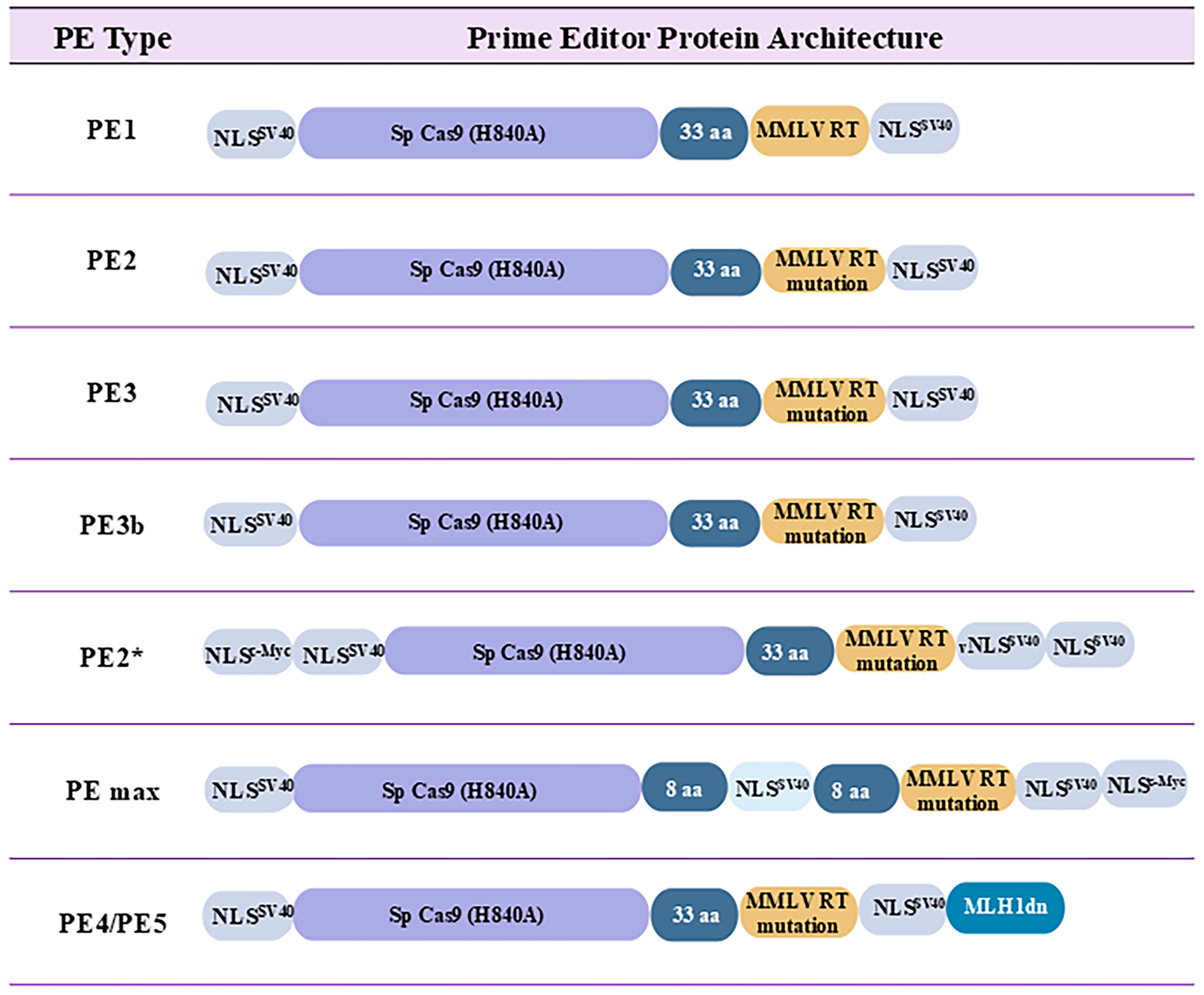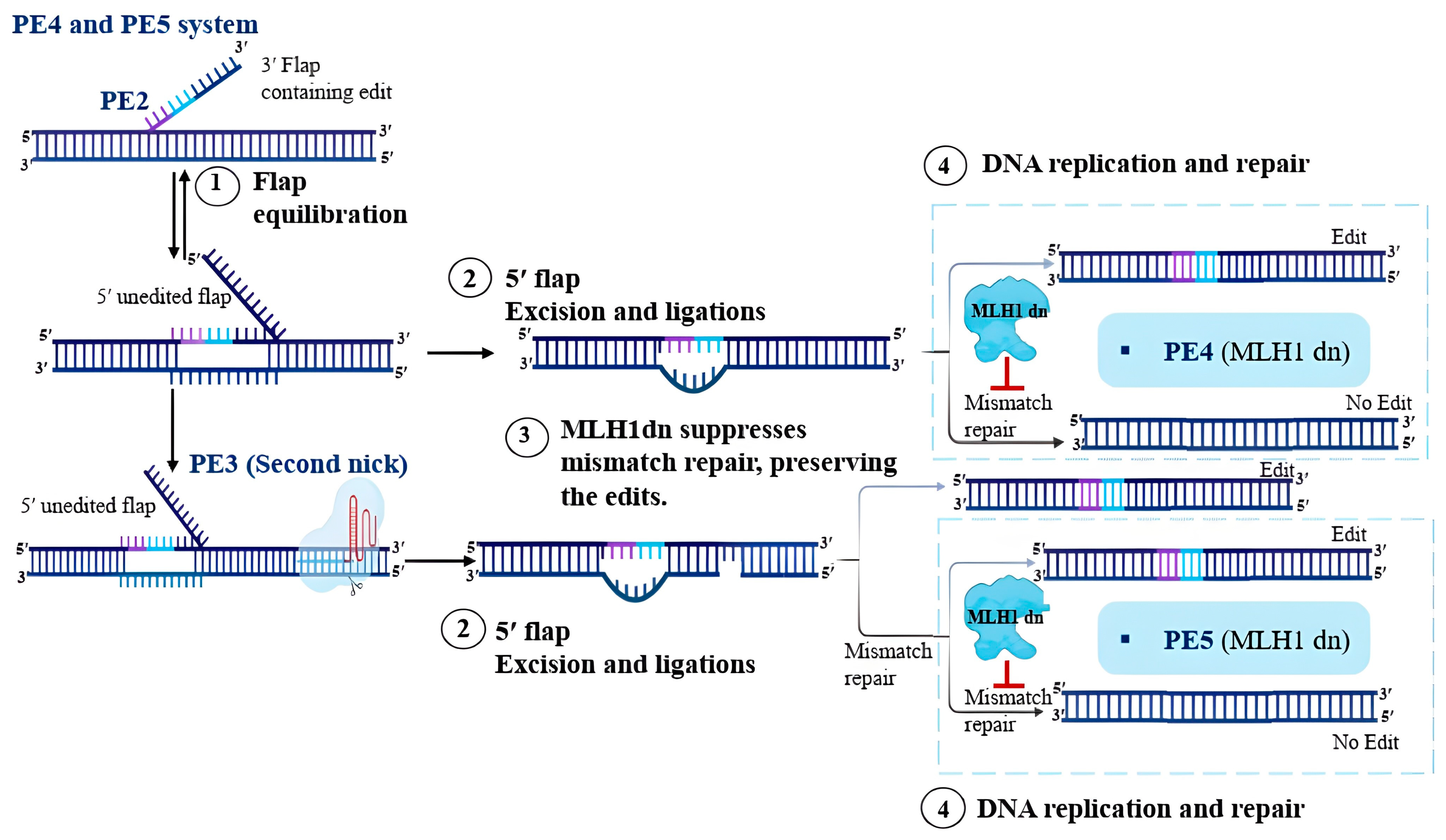| PE4 | Same as PE2/PE3 | pegRNA + MLH-1 dd | Higher in human pluripotent stem cells | Improves editing efficiency by suppressing MLH-1. |