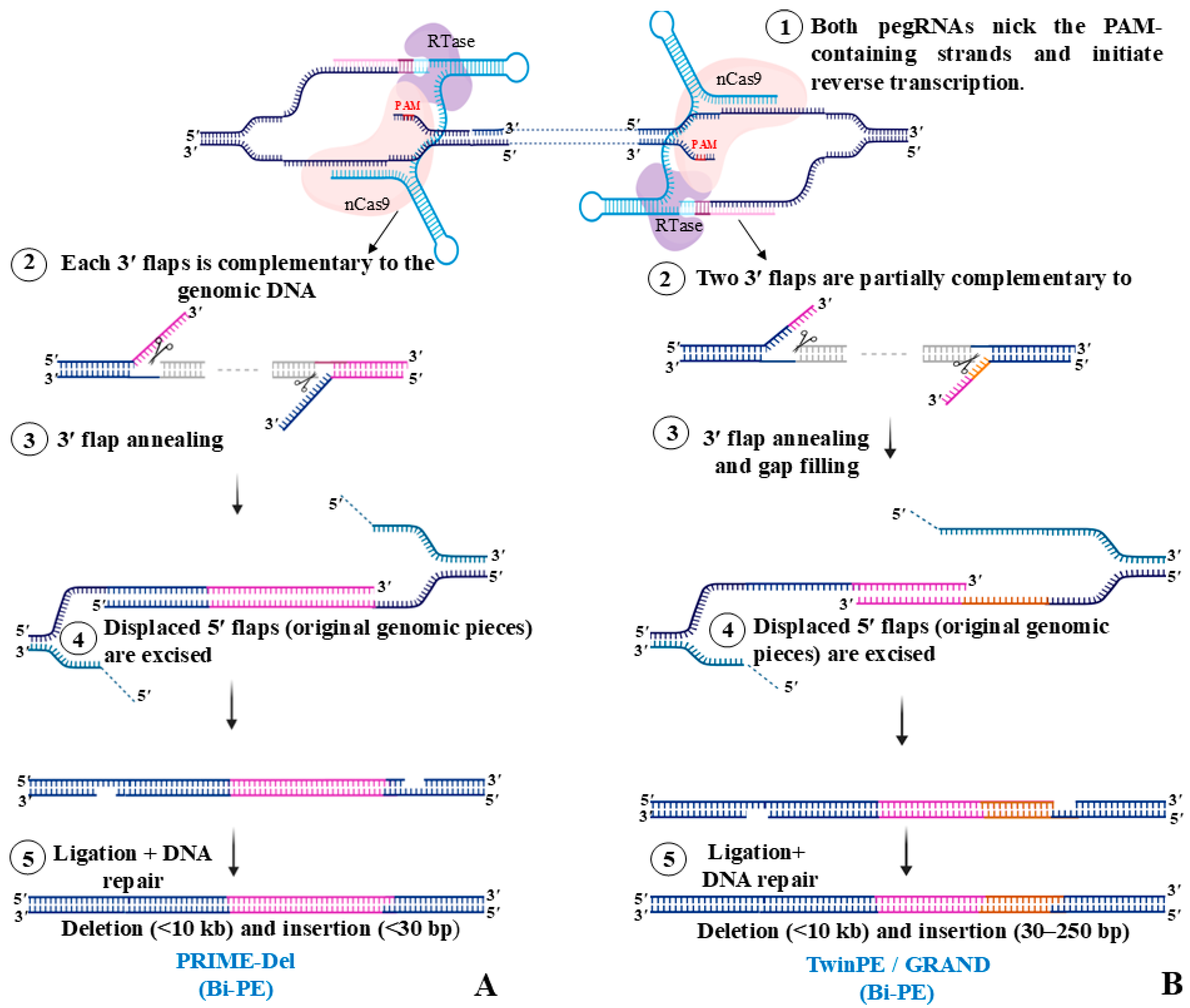 - Anzalone, A.V.; Gao, X.D.; Podracky, C.J.; Nelson, A.T.; Koblan, L.W.; Raguram, A.; Levy, J.M.; Mercer, J.A.; Liu, D.R. Programmable Deletion, Replacement, Integration and Inversion of Large DNA Sequences with Twin Prime Editing. Nat. Biotechnol. 2022, 40, 731–740. [Google Scholar] [CrossRef]