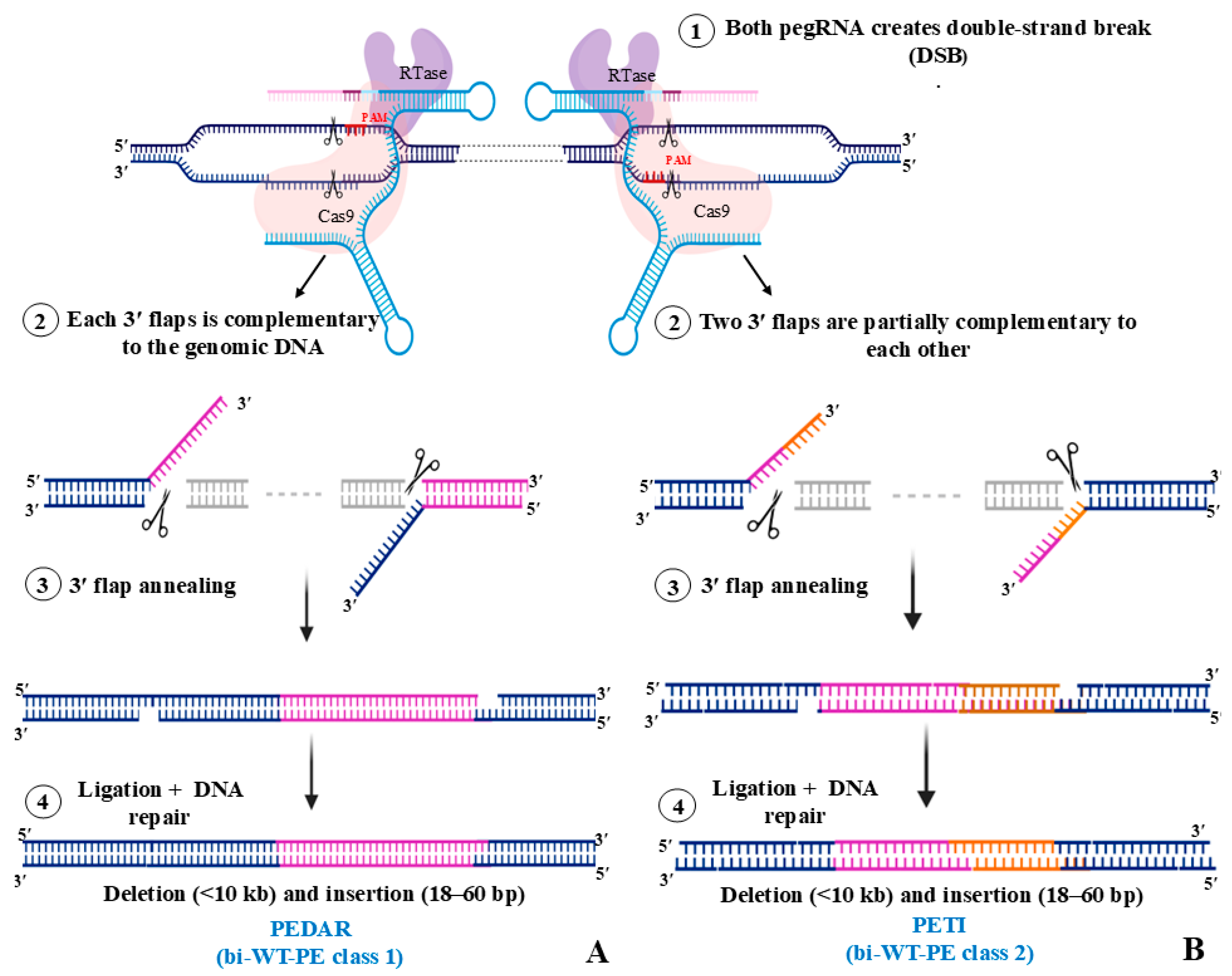 - Jiang, T.; Zhang, X.O.; Weng, Z.; Xue, W. Deletion and Replacement of Long Genomic Sequences Using Prime Editing. Nat. Biotechnol. 2022, 40, 227–234. [Google Scholar] [CrossRef]
