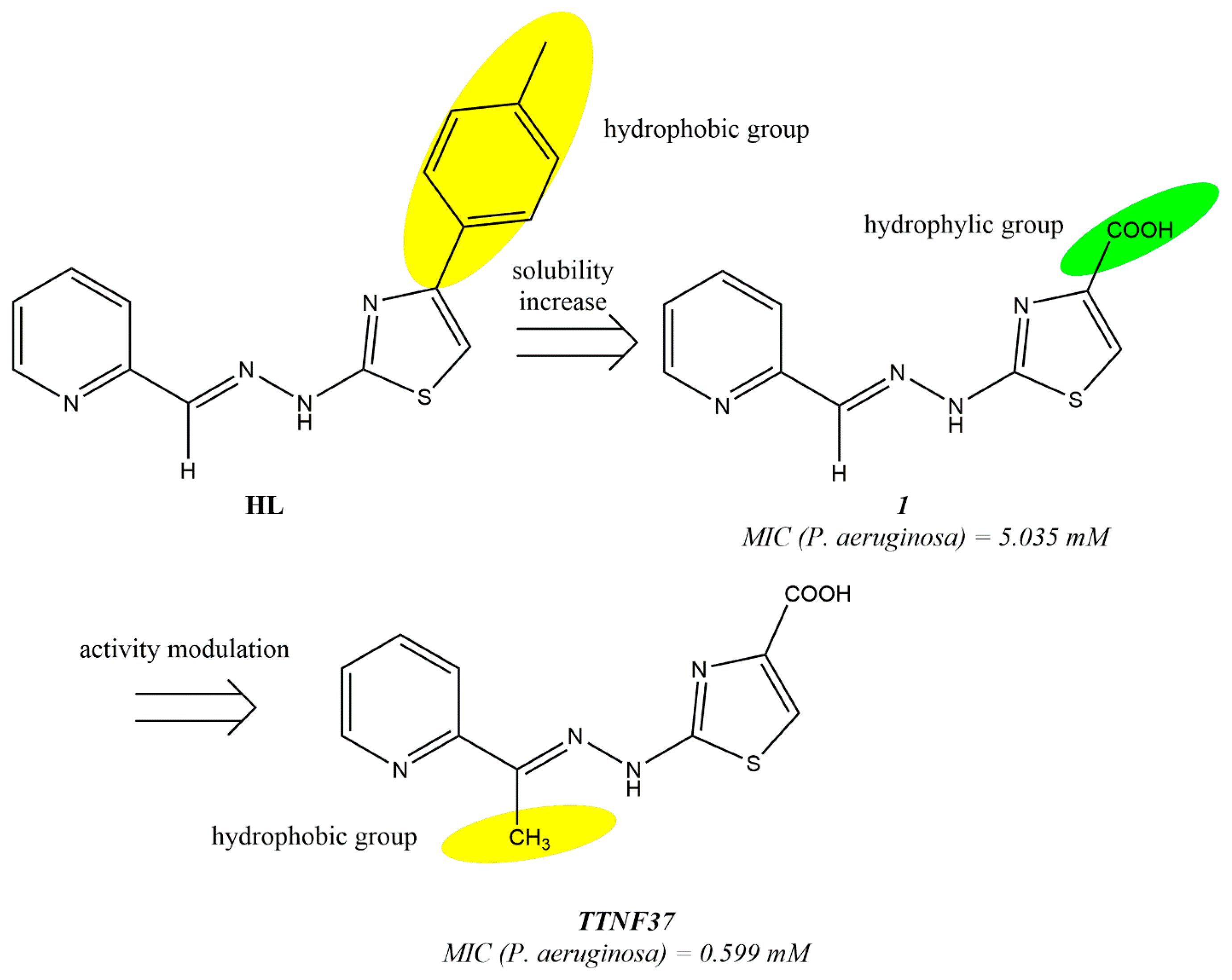 - Borges, A.; Simões, M.; Todorović, T.R.; Filipović, N.R.; Garcia-Sosa, A.T. Cobalt Complex with Thiazole-Based Ligand as New Pseudomonas aeruginosa Quorum Quencher, Biofilm Inhibitor and Virulence Attenuator. Molecules 2018, 23, 1385. [Google Scholar] [CrossRef]