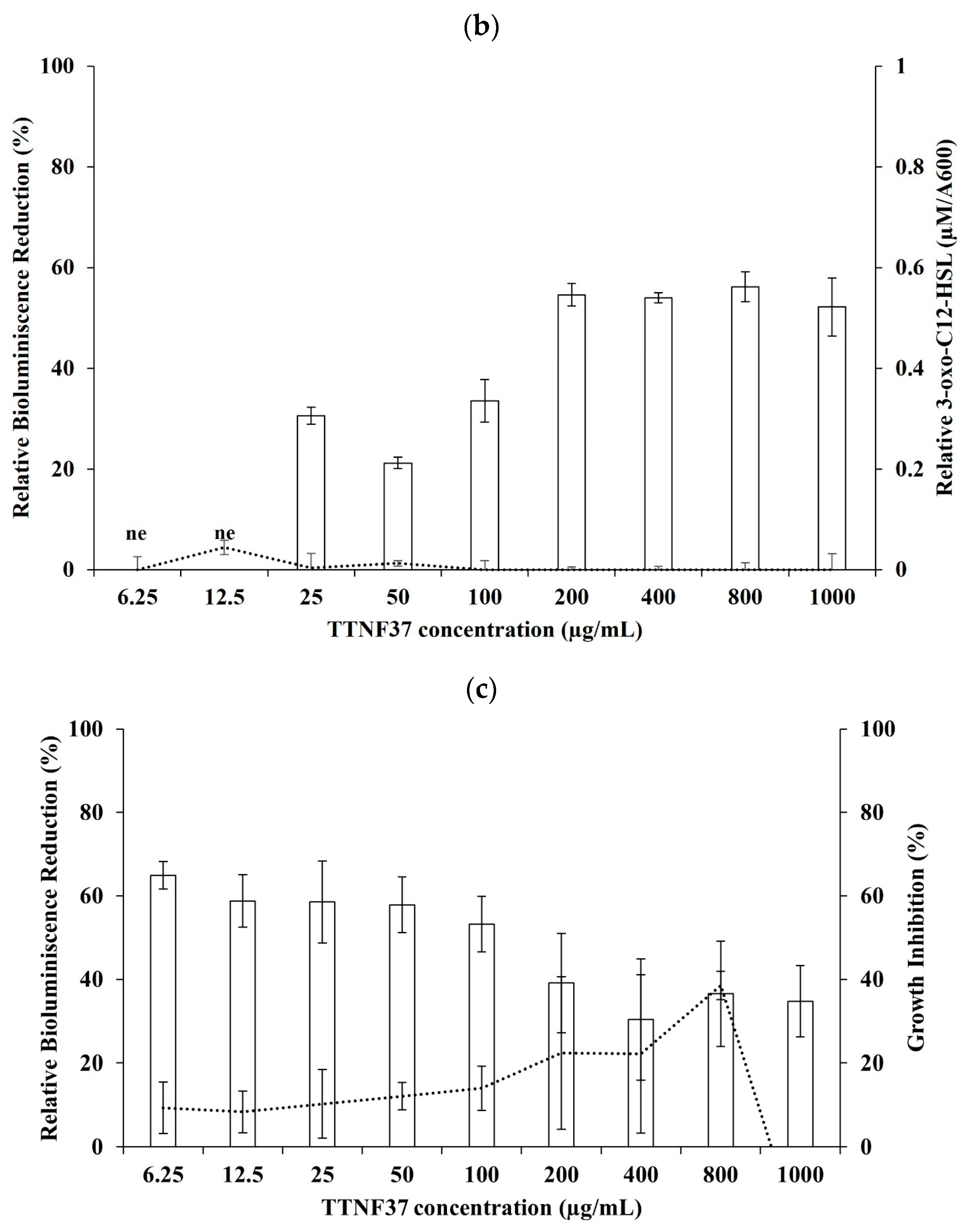 3.2.5. Screening of the TTNF37 Anti-QS Activity