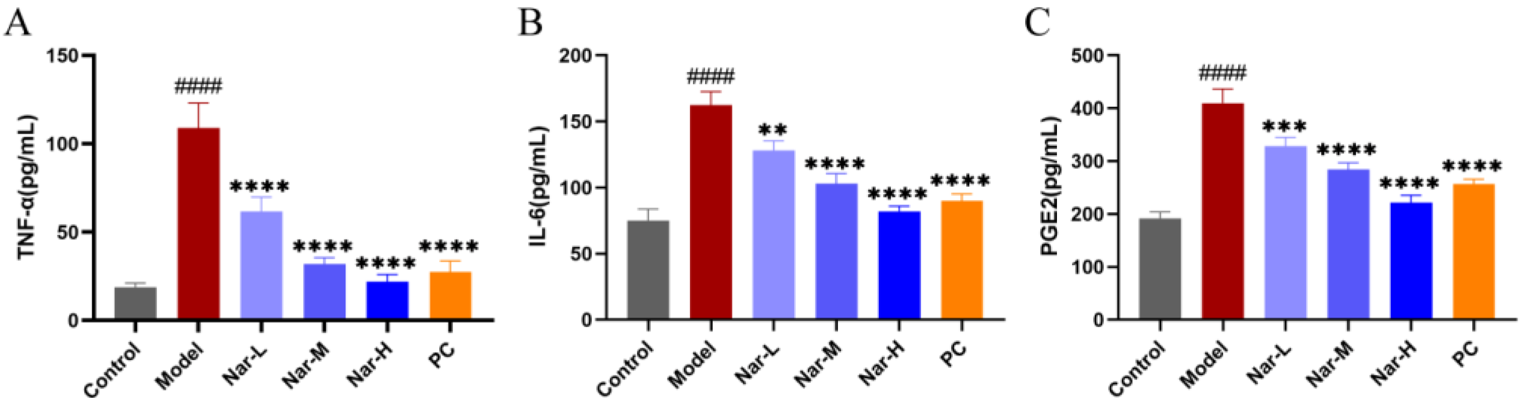 2.7. Effects of Naringin and Celecoxib on Inflammatory Cytokine Secretion