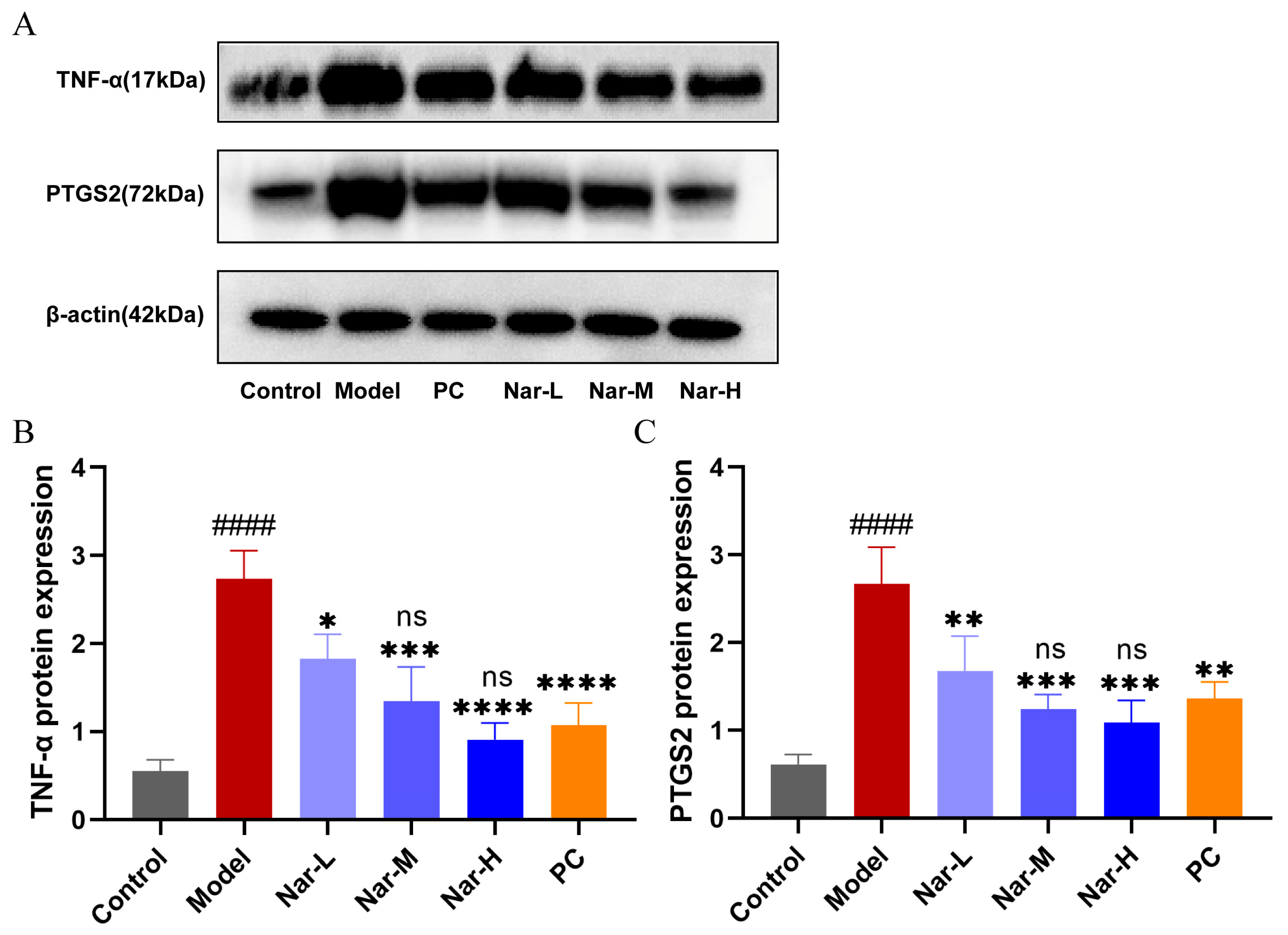 2.9. Effects of Naringin and Celecoxib on TNF-α and PTGS2 Protein Expression