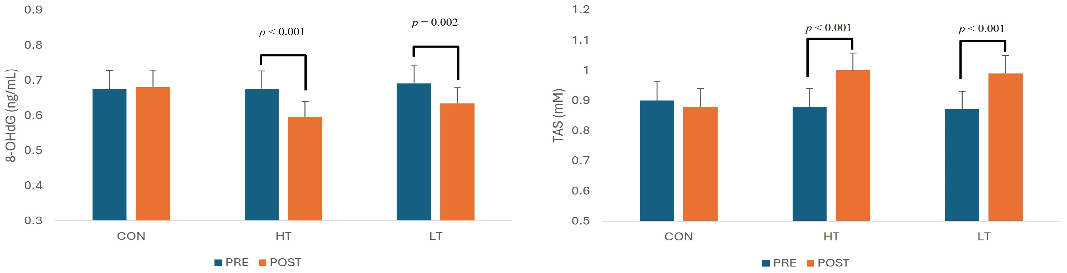 | HT | 42.33 ± 5.84 | 37.36 ± 4.83 | −4.97 | <0.001 ** | |