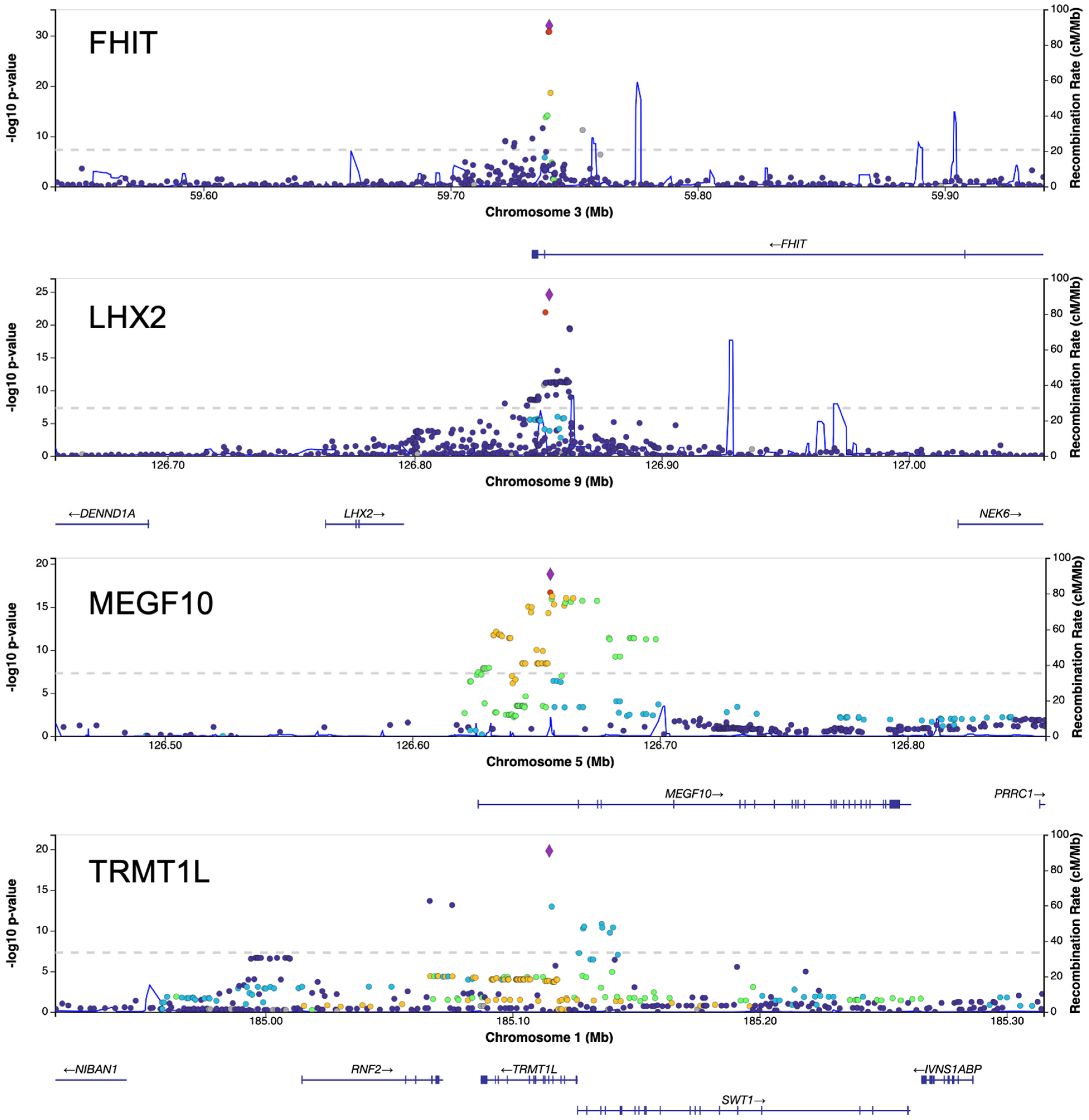 | MEGF10 (chr5) | 1 | post-all | 5.72239 × 10−6 [5:125618842] | Removed by conditioning |