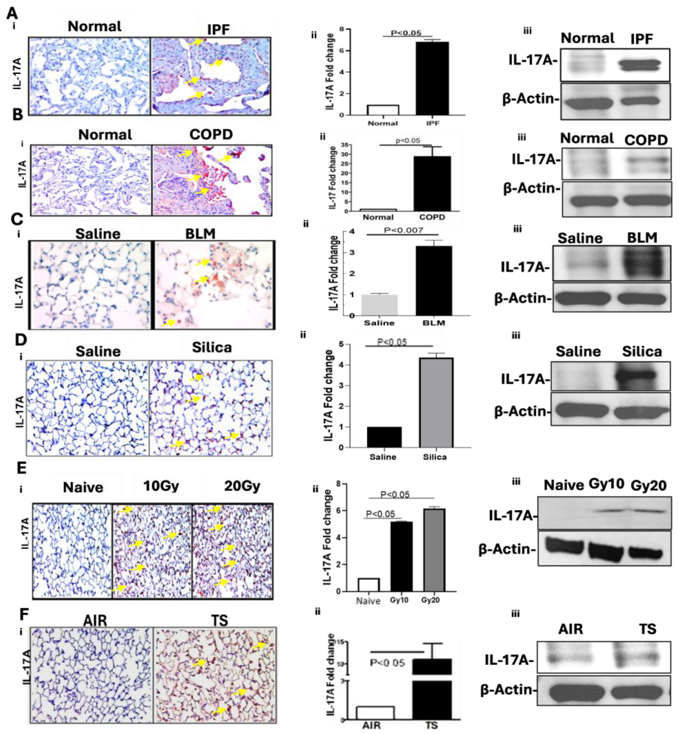 2.1. Increased IL-17A Levels in Lung Tissues of Patients with IPF and COPD and Mice with BLM-, TSE-, Silica- and TR-Induced Lung Injuries
