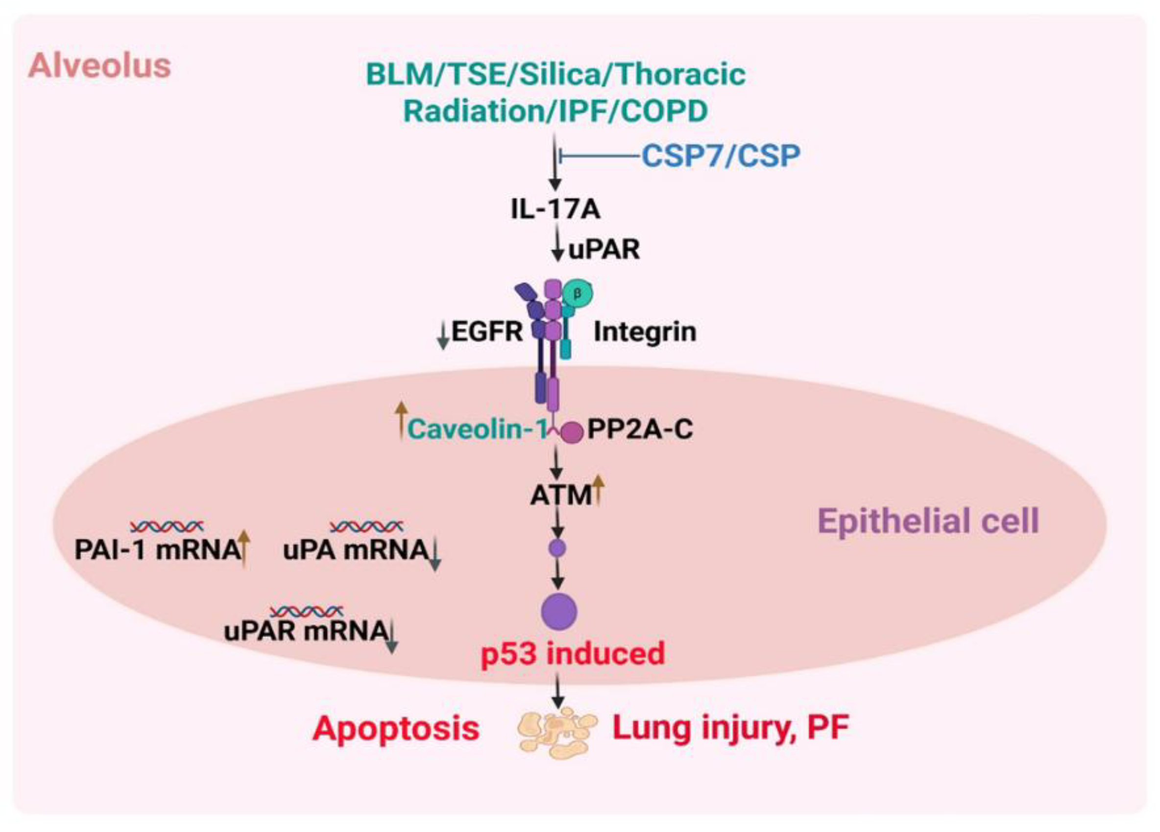 - Puthusseri, B.; Bhagavath, A.K.; Korir, D.; Shetty, R.; Johnson, G.A.; Stankowska, D.L.; Konduru, N.V.; Tang, H.; Bolla, S.; Criner, G.J.; et al. CSP7 Protects Alveolar Epithelial Cells by Targeting p53-Fibrinolytic Pathways During Lung Injuries. Am. J. Respir. Cell Mol. Biol. 2024, 72, 97–108. [Google Scholar] [CrossRef]
