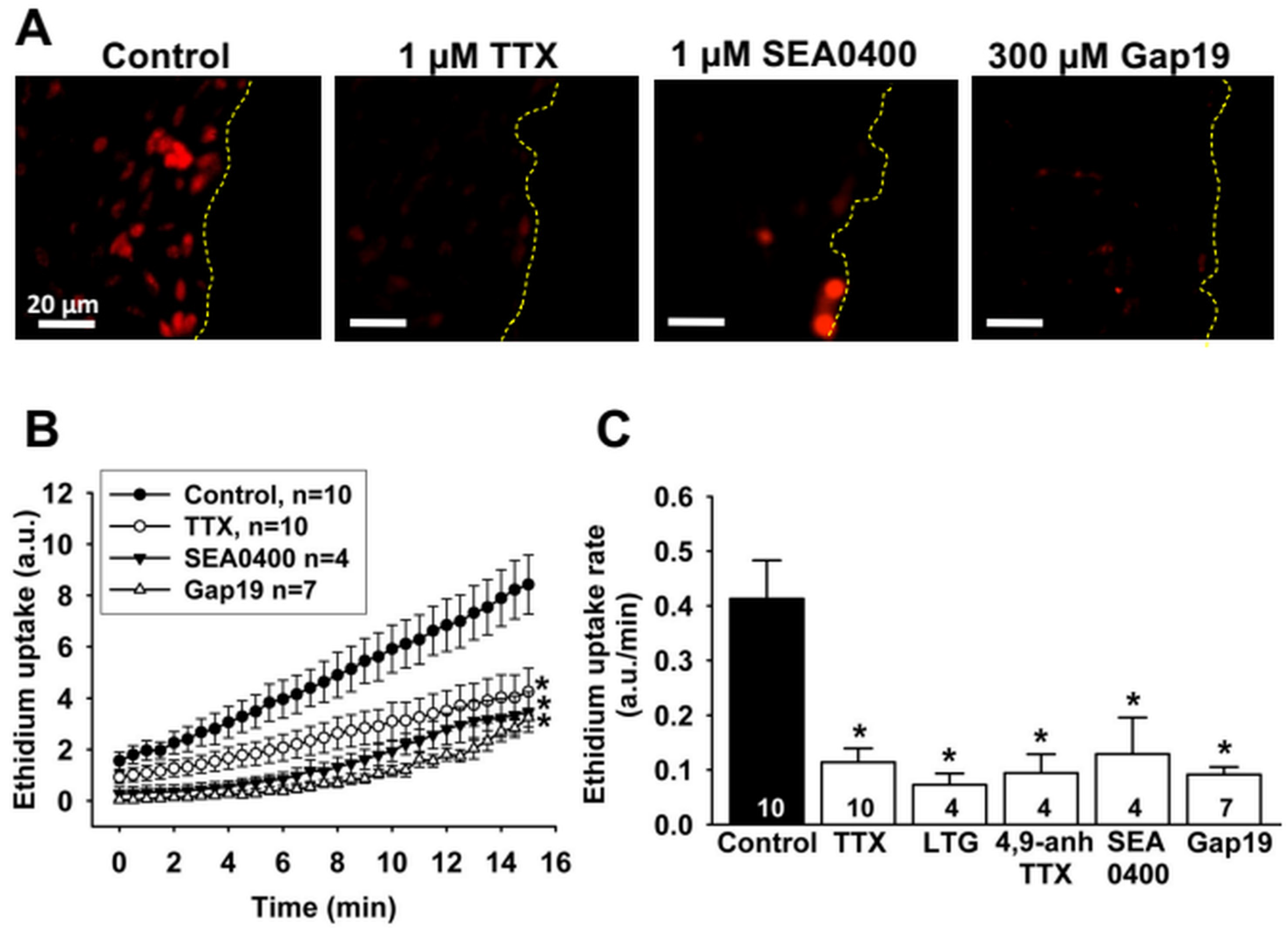 - Espinoza, H.; Figueroa, X.F. Opening of Cx43-formed hemichannels mediates the Ca2+ signaling associated with endothelial cell migration. Biol. Direct 2023, 18, 52. [Google Scholar] [CrossRef]