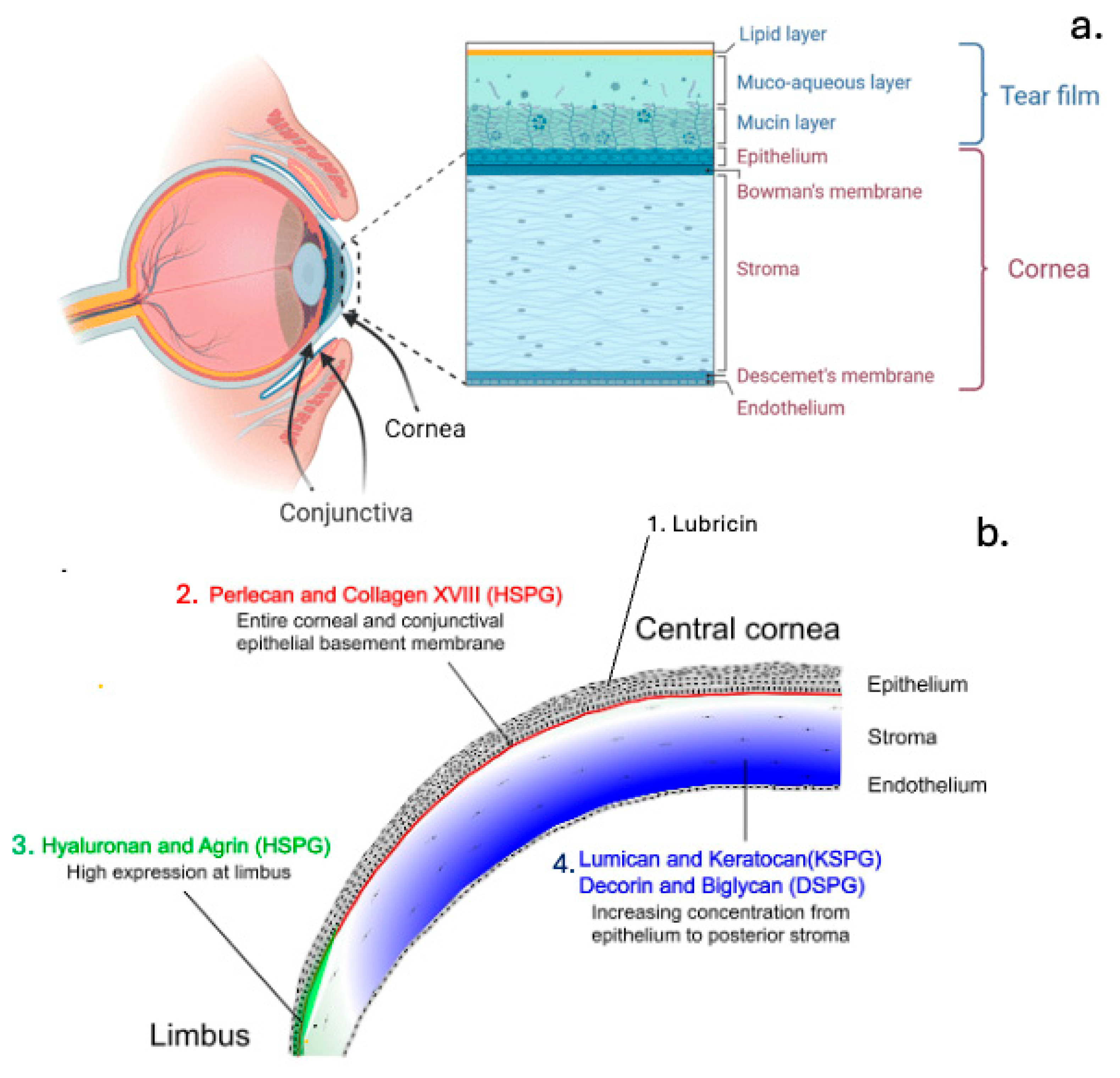 - Puri, S.; Coulson-Thomas, Y.M.; Gesteira, T.F.; Coulson-Thomas, V.J. Distribution and Function of Glycosaminoglycans and Proteoglycans in the Development, Homeostasis and Pathology of the Ocular Surface. Front. Cell Dev. Biol. 2020, 8, 731. [Google Scholar] [CrossRef]