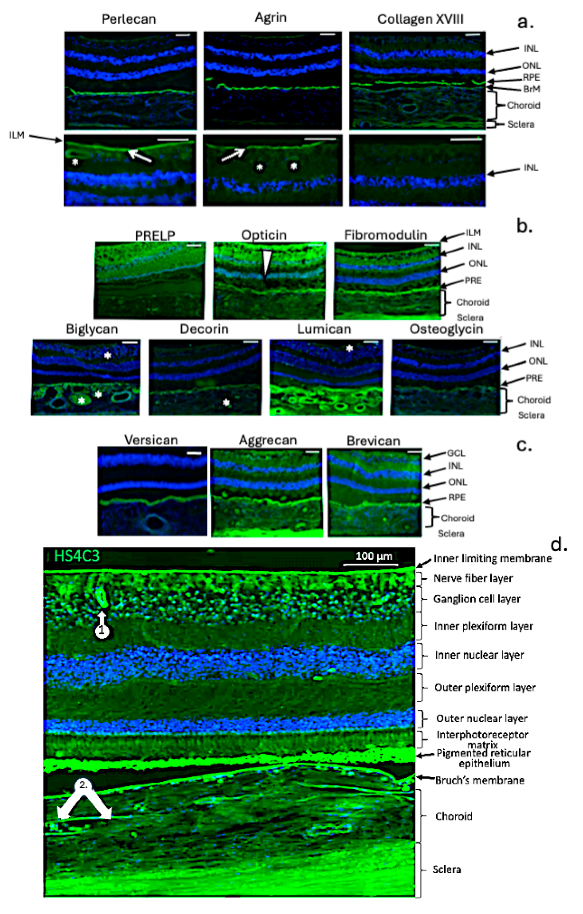 - Keenan, T.; Clark, S.J.; Unwin, R.D.; Ridge, L.A.; Day, A.J.; Bishop, P.N. Mapping the differential distribution of proteoglycan core proteins in the adult human retina, choroid, and sclera. Investig. Ophthalmol. Vis. Sci. 2012, 53, 7528–7538. [Google Scholar] [CrossRef]