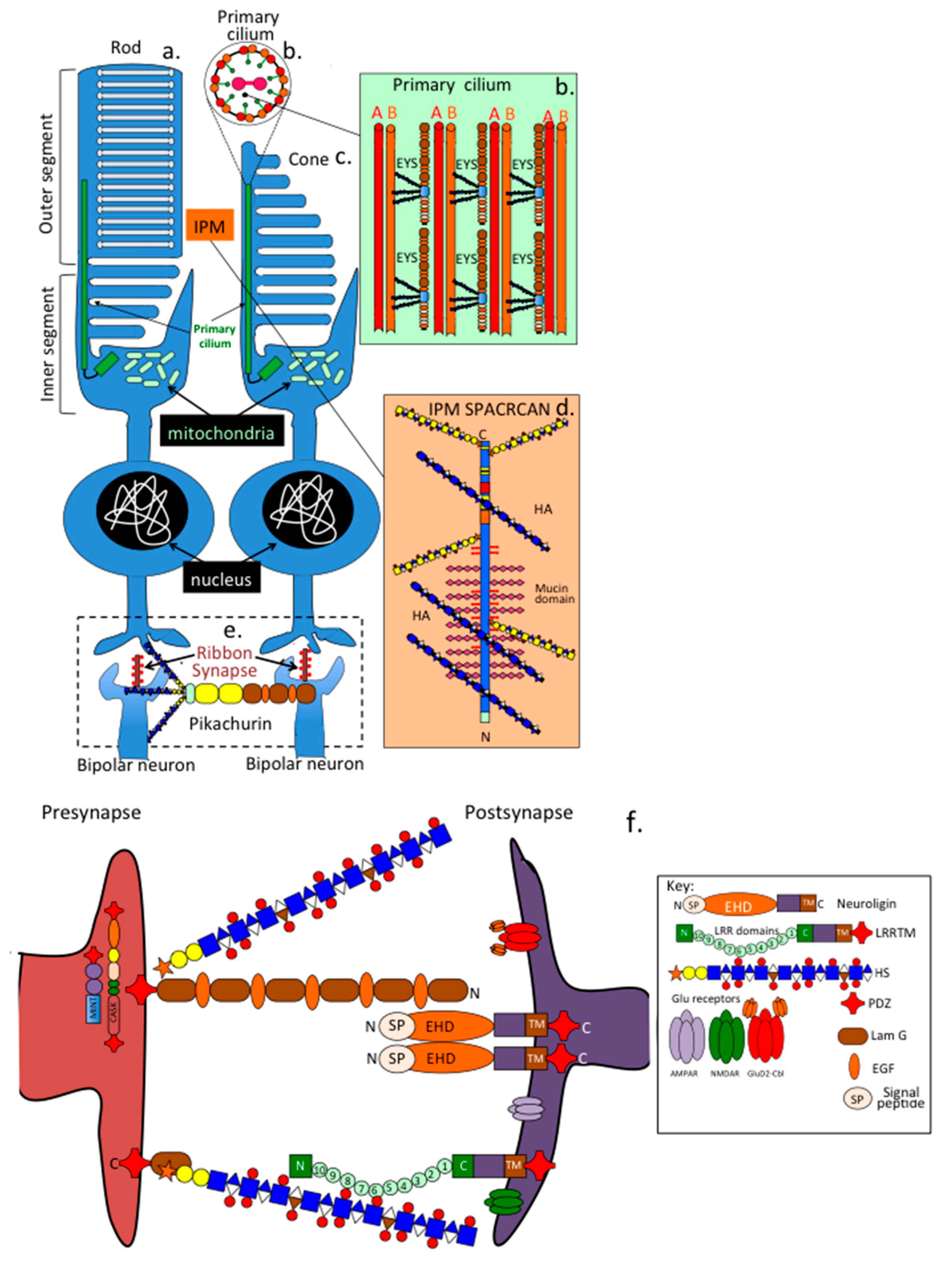 - Orlandi, C.; Omori, Y.; Wang, Y.; Cao, Y.; Ueno, A.; Roux, M.J.; Condomitti, G.; de Wit, J.; Kanagawa, M.; Furukawa, T.; et al. Transsynaptic Binding of Orphan Receptor GPR179 to Dystroglycan-Pikachurin Complex Is Essential for the Synaptic Organization of Photoreceptors. Cell Rep. 2018, 25, 130–145.e5. [Google Scholar] [CrossRef]