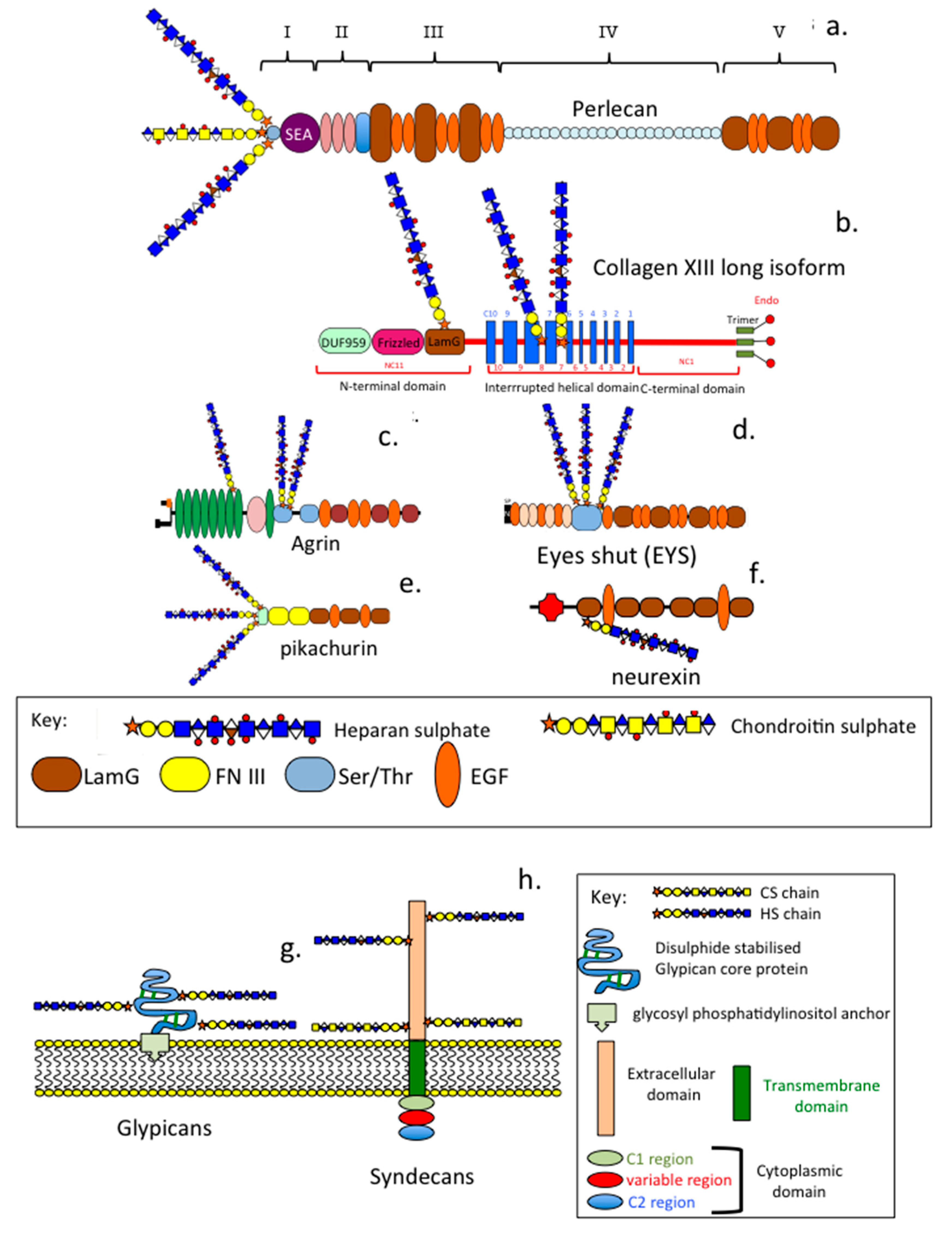 - Farrugia, B.; Melrose, J. The Glycosaminoglycan Side Chains and Modular Core Proteins of Heparan Sulphate Proteoglycans and the Varied Ways They Provide Tissue Protection by Regulating Physiological Processes and Cellular Behaviour. Int. J. Mol. Sci. 2023, 24, 14101. [Google Scholar] [CrossRef] [PubMed]