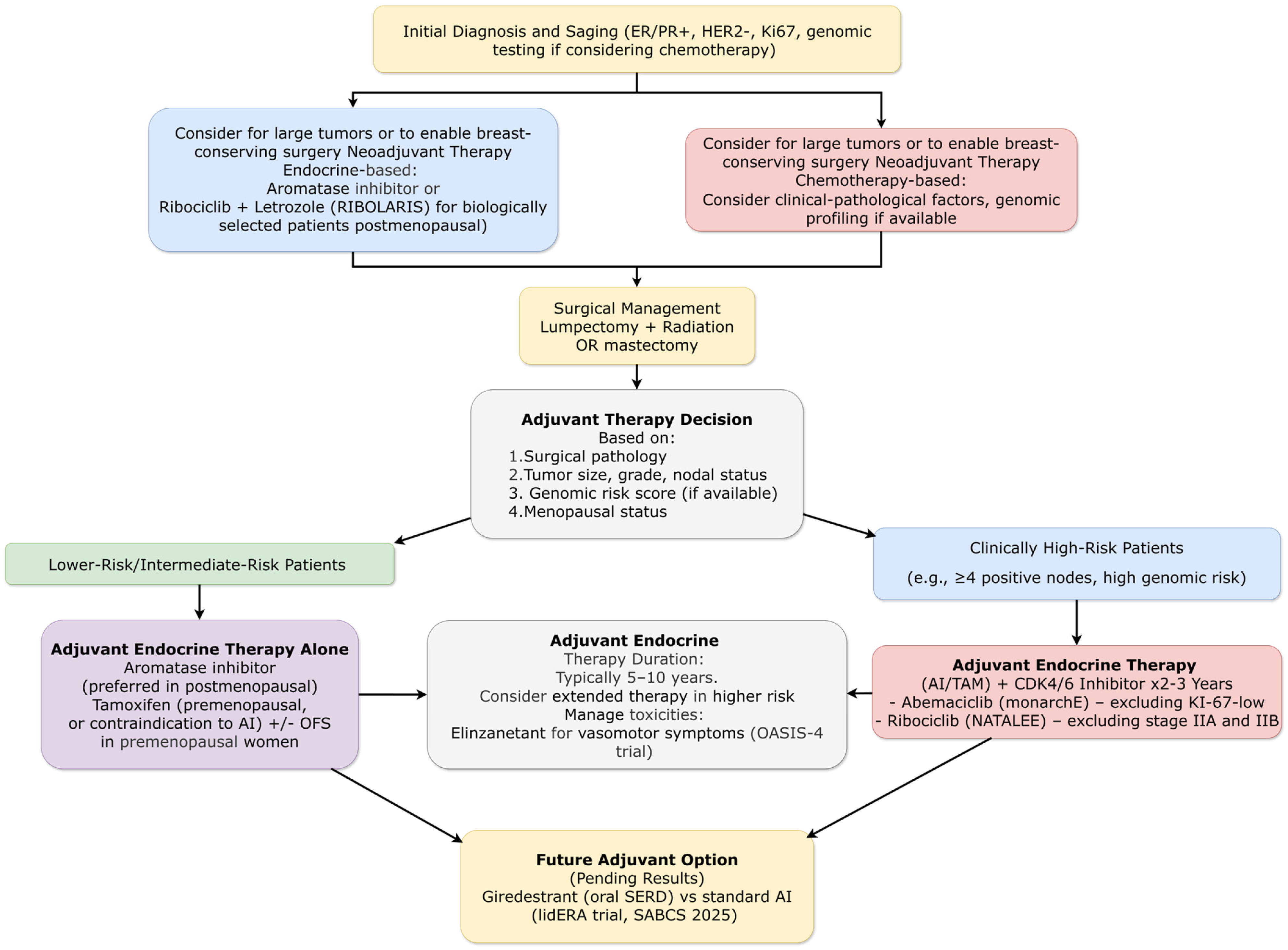 | RIBOLARIS (ESMO 2025) [6] | II | HR+/HER2− Early BC, clinically high-risk | Neoadj. Ribociclib + Letrozole → ROR-guided adj. therapy | - | DMFS in ROR-low | 52.6% achieved low ROR, omitting chemo. Neoadj. progression: 2.19%. | Neutropenia, liver enzyme elevations. |