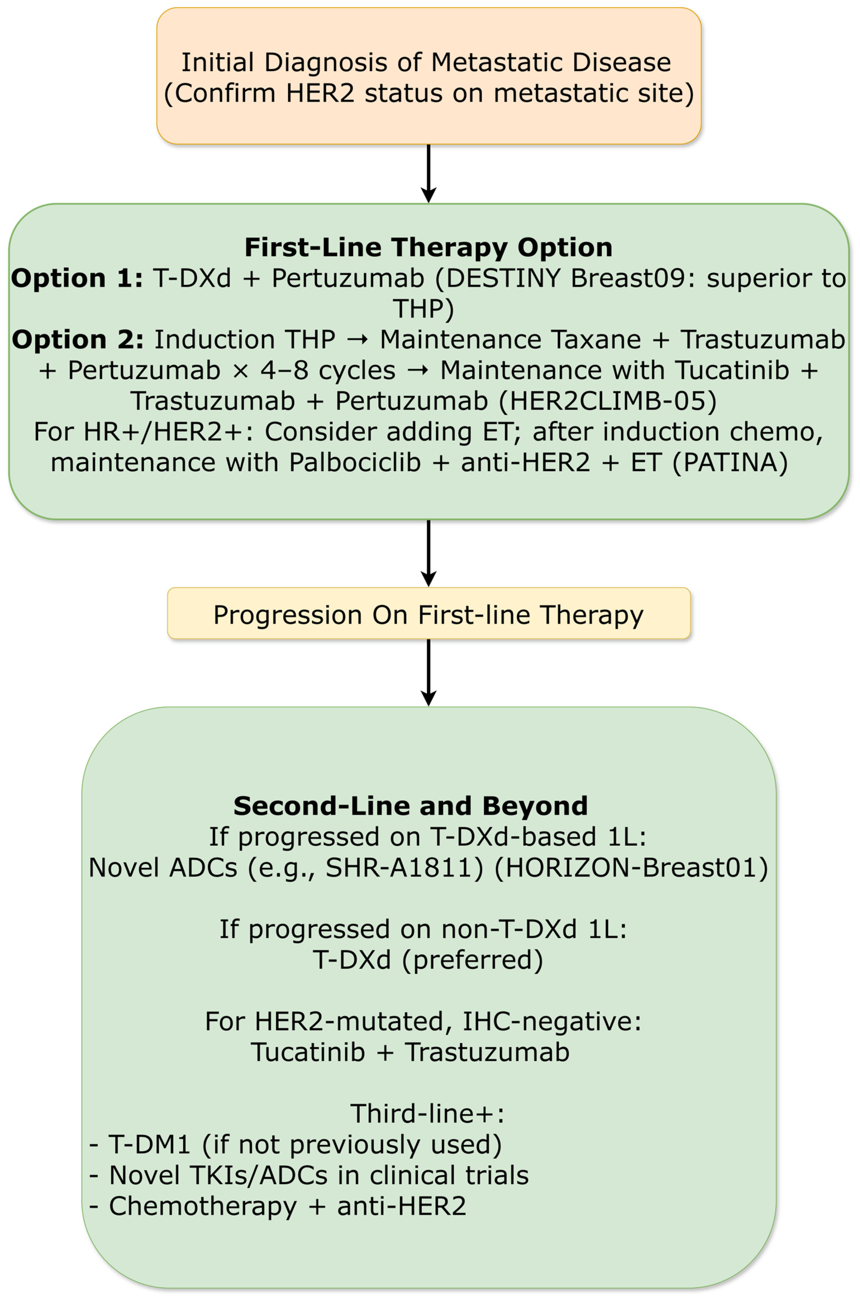 | HER2CLIMB-05 (SABCS 2025) [35] | III | HER2+ MBC, no progression after 4–8 cycles of 1 L THP | Maintenance: Tucatinib + Trastuzumab + Pertuzumab | Maintenance: Placebo + Trastuzumab + Pertuzumab | PFS | Median PFS: 24.9 vs. 16.3 mo (HR 0.58, p < 0.0001). Benefit across subgroups (HR− and HR+). | Safety consistent with known tucatinib profile (diarrhea, hepatotoxicity). |