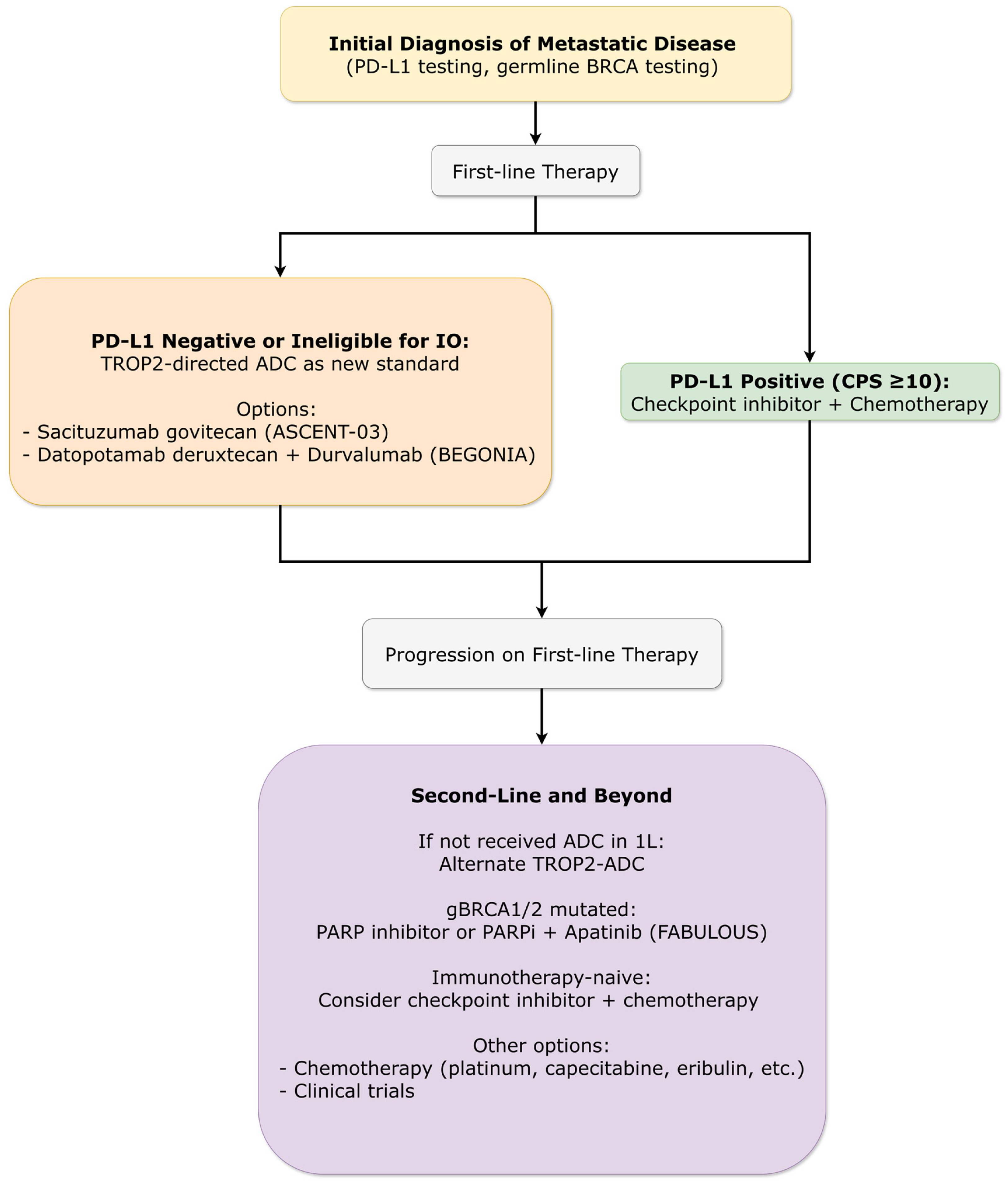 | ASCENT-4/KEYNOTE-D19 (ASCO 2025) [46] | III | Previously untreated PD-L1-positive advanced triple-negative breast cancer (TNBC) | Sacituzumab Govitecan + Pembrolizumab | Chemotherapy (paclitaxel, nab-paclitaxel, or gemcitabine/carboplatin) + Pembrolizumab | PFS by BICR | Median PFS: 11.2 vs. 7.8 months (HR = 0.65; 95% CI: 0.52–0.81; p < 0.001). Objective Response Rate (ORR): 55% vs. 47%. | Grade ≥ 3 adverse events: 68% vs. 65%. Neutropenia: 45% vs. 38%; Diarrhea: 12% vs. 5%. Treatment discontinuation due to adverse events: 8% vs. 6%. |