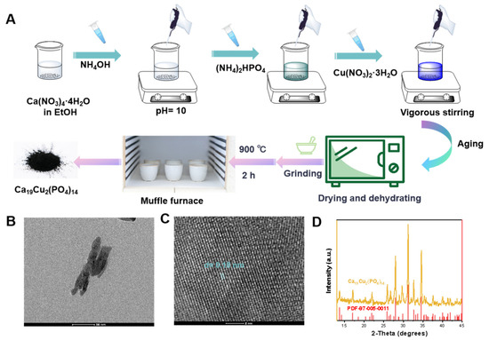 Schematic illustration of the synthesis (A), TEM image (B), HRTEM image (C) and XRD (D) of Ca19Cu2(PO4)14 nanomaterials.