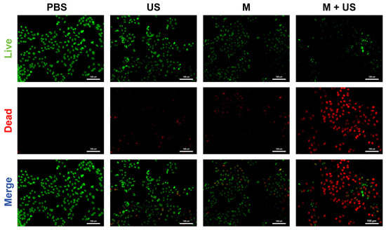 Confocal fluorescence micrographs of 4T1 cells stained with Calcein-AM/PI after different treatments. (Scale bar = 100 µm).