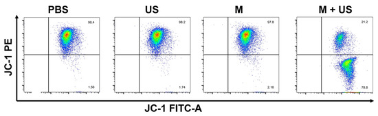 Mitochondrial membrane potential test after 8 h of 4T1 cells with PBS, US, Ca19Cu2(PO4)14, and Ca19Cu2(PO4)14 + US, respectively.